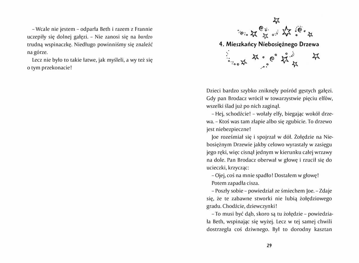 Niebosiężne Drzewo pełne jest nietypowych mieszkańców. Madame Piorę cały czas wylewa na wszystkich brudną wodę z prania. Wróżka Puszka karmi dzieci pysznymi Wybuchowymi Ciasteczkami. A pan Księżyc pozwala im zjechać po ogromnej poduszkowej zjeżdżalni, ale pod warunkiem że wrócą i przyniosą mu… toffi. Frannie, Beth i Joe wiedzą, że muszą dotrzymać obietnicy i wspiąć się ponownie na Niebosiężne Drzewo, choć trochę obawiają się tego, do jakiej krainy trafią tym razem.