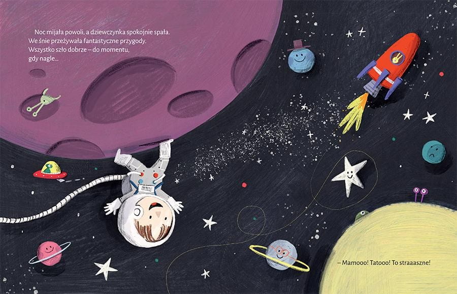 Dziś Matylda po raz pierwszy śpi sama w swoim pokoju, w nowym dużym łóżku. Jest bardzo podekscytowana, ale też trochę się boi... Na szczęście rodzice pomagają jej w tej nowej sytuacji. Matylda dostaje wymarzoną pościel w planety, wie też co zrobić jeśli przyśni się zły sen. Matylda szybko przekonuje się, że spanie w swoim łóżku to… wielka przygoda, a o zmartwieniach dobrze jest komuś powiedzieć, wtedy nie są już takie straszne.