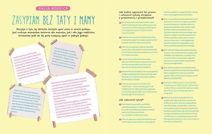 Zasypiamy bez mamy to opowieść o tym, jak pomóc dzieciom i dorosłym w tak ważnym momencie dla całej rodziny. Prostej historyjce towarzyszą porady specjalistki w dziedzinie rozwoju emocjonalnego. Poruszono w nich takie tematy jak wypracowanie wieczornych rytuałów, relaksacje, strach przed ciemnością oraz lęki związane z koszmarami.