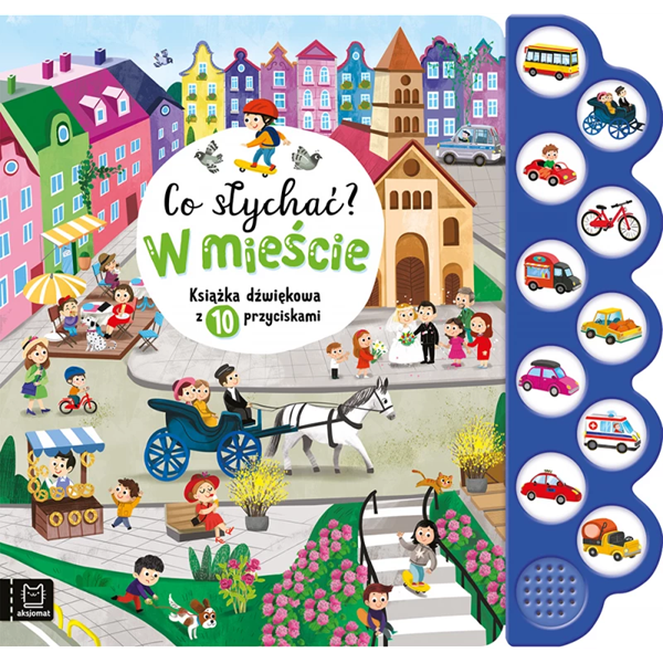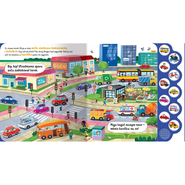 Maluchy z zapałem poznają świat, używając do tego wszystkich zmysłów. Książka dźwiękowa z przyciskami i bogatymi ilustracjami odpowiada ich potrzebom. Bawiąc się nią, dzieci poznają pojazdy, dowiadują się, jak się żyje w mieście, a powtarzając wierszyki i naśladując odgłosy, rozwijają pamięć, słuch oraz wrażliwość na słowo i obraz.