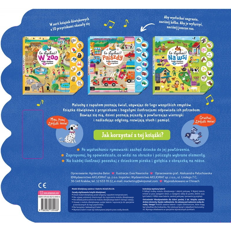 OSTRZEŻENIE! Nieodpowiednie dla dzieci poniżej 3 lat. Książka zawiera drobne elementy. Ryzyko zadławienia. Do zabawy pod nadzorem osoby dorosłej. Uwaga! Produkt zawiera baterie i części elektroniczne, które mogą być szkodliwe dla środowiska. Nie należy go łączyć z odpadkami komunalnymi. Wymaga składowania w specjalnie wyznaczonych punktach.