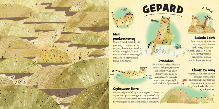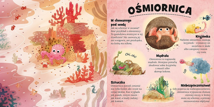 W książeczce schowało się aż 20 zwierząt, mistrzów kamuflażu. Czy potrafisz je znaleźć? z pomocą spieszą ruchowe elementy strony? Dodatkowo każda strona zawiera krótkie i ciekawe informacje o zwierzętach takich jak: gepard, jeleń, żółw morski, ośmiornica, wąż. Na końcu książki jest zadanie dla dzieci - wyszykowanie i obserwowanie ukrytych stworzeń.
