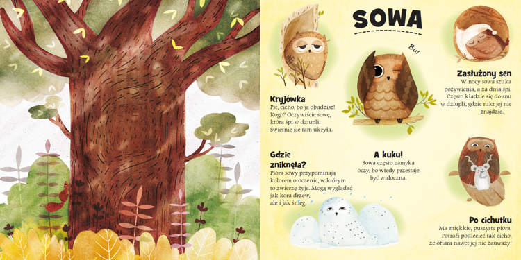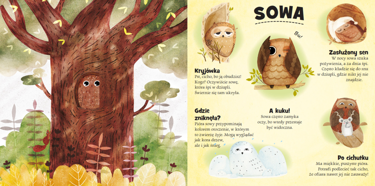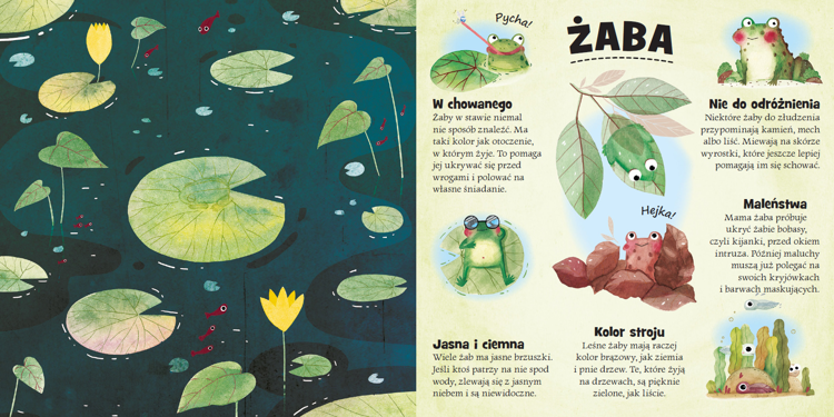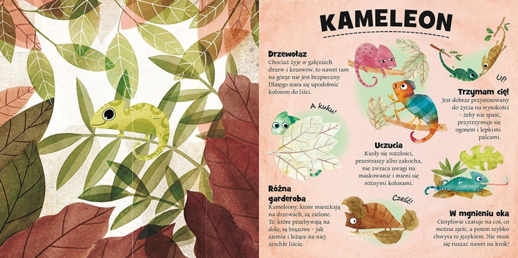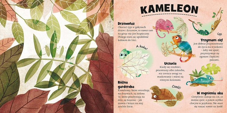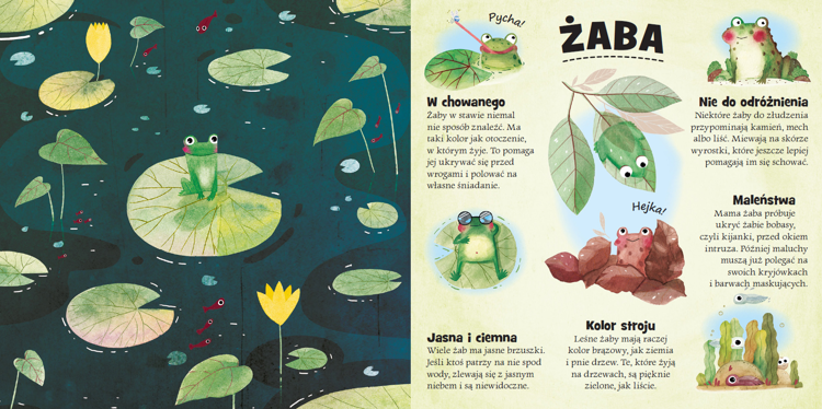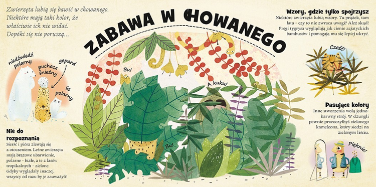 W książeczce schowało się aż 20 zwierząt, mistrzów kamuflażu. Czy potrafisz je znaleźć? z pomocą spieszą ruchowe elementy strony? Dodatkowo każda strona zawiera krótkie i ciekawe informacje o zwierzętach takich jak: sowa, kameleon, lis polarny, żaba, leniwiec. Na końcu książki jest zadanie dla dzieci - wyszykowanie i obserwowanie ukrytych stworzeń.