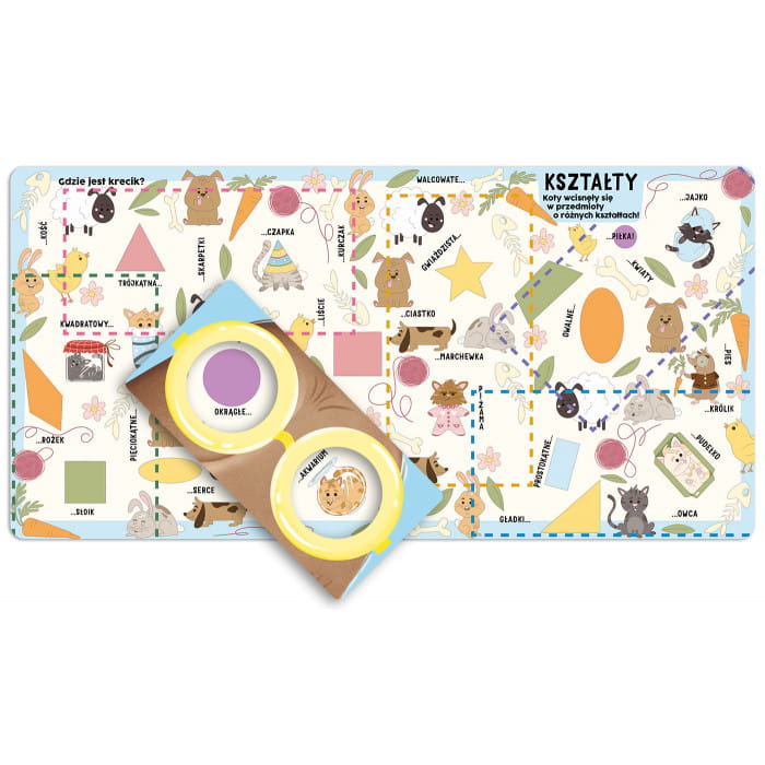 Na kolejnych stronach mały czytelnik będzie przykładał magiczne okulary, żeby wyszukiwać i porządkować: liczby, kolory, emocje, kształty i przeciwieństwa. Dzięki temu utrwali swoją wiedzę, a przy okazji rozwinie spostrzegawczość i koordynację.