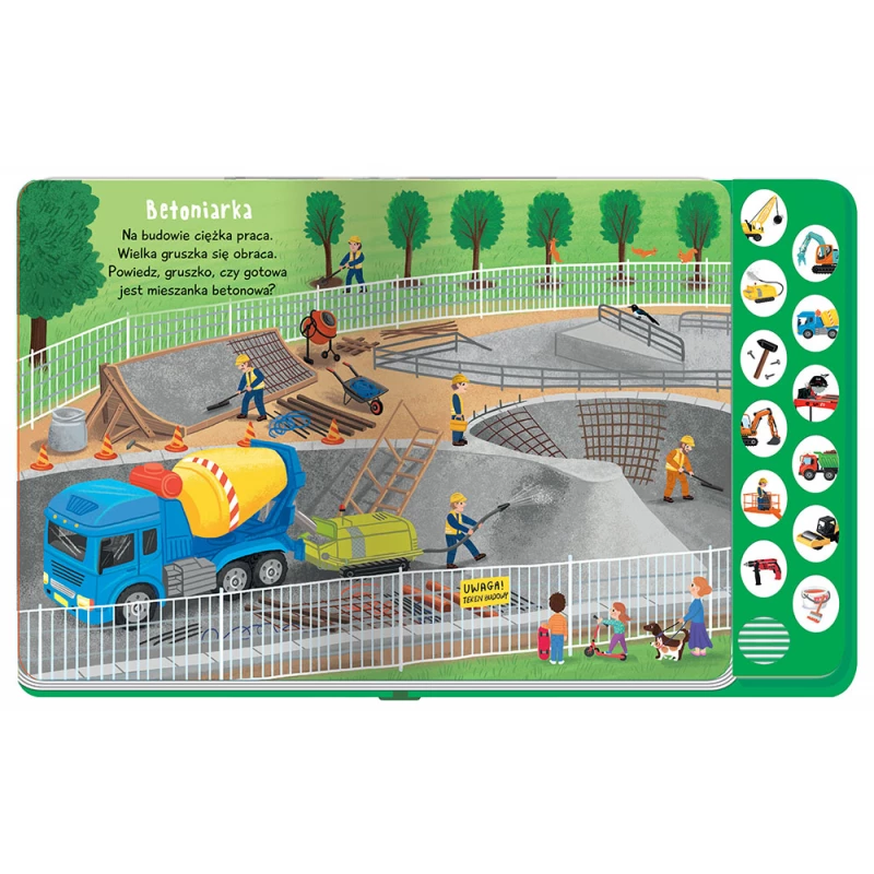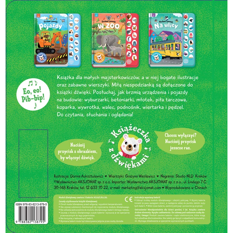 Książka dla małych majsterkowiczów i miłośników motoryzacji, a w niej bogate i staranne ilustracje oraz wierszowane historyjki o pojazdach, przedmiotach i urządzeniach na budowie. Dodatkową niespodzianką dla dzieci są dołączone dźwięki. Posłuchaj, jak brzmią: auto z kulą do wyburzania, nożyce do cięcia betonu, stacjonarna pompa do betonu, betoniarka, wbijający gwoździe młotek, piła tarczowa, koparka, wywrotka, podnośnik, walec, wiertarka i malujący pędzel. Naciśnij przycisk z obrazkiem, aby włączyć dźwięk. Chcesz wyłączyć? Naciśnij przycisk jeszcze raz. Zabawa z książką rozwija zmysły malucha. Wesołe i łatwe do zapamiętania wierszyki rozwijają pamięć i percepcję dziecka, które wzbogaca również swoją wiedzę o odgłosy wydawane przez pokazane w książce pojazdy i przedmioty. Twarda oprawa i kartonowe karty sprawiają, że książka jest trwała i bezpieczna, a format odpowiedni dla małego dziecka. Do czytania, słuchania i oglądania!