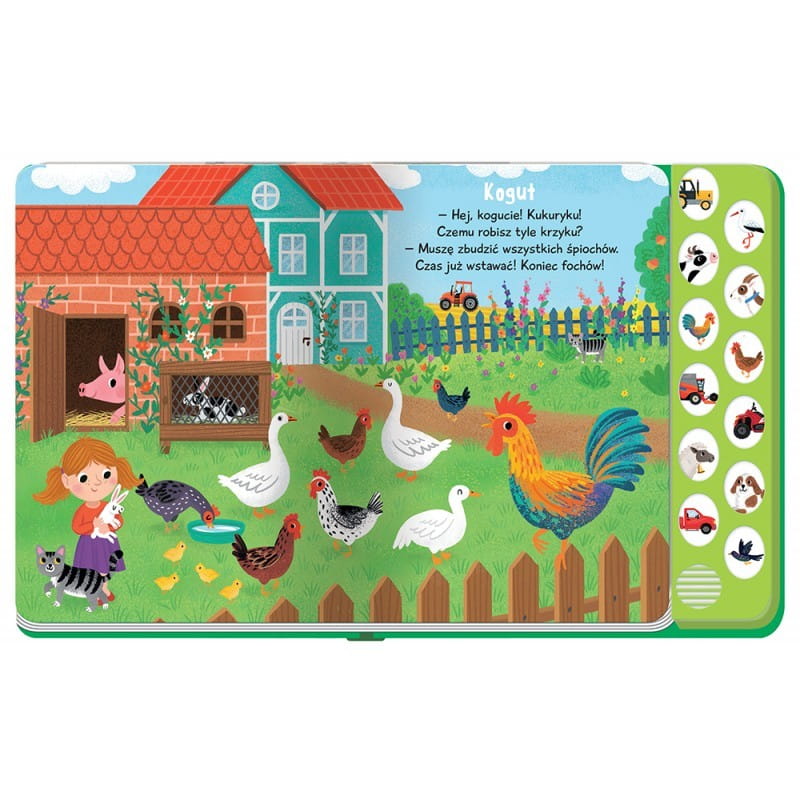 Książka dla małych miłośników zwierząt i pojazdów, a w niej bogate ilustracje oraz wierszowane historyjki. Dodatkową atrakcją są dołączone dźwięki. Posłuchaj, jak brzmią: traktor, krowa, kogut, kombajn, bocian, owca oraz inne pojazdy i zwierzęta pokazane w książce. Do czytania, słuchania i oglądania!