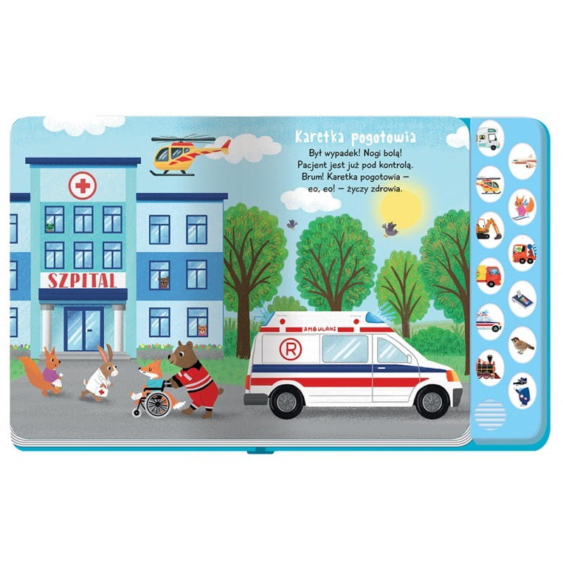 Książka dla małych miłośników motoryzacji, a w niej bogate ilustracje oraz wierszowane historyjki. Dodatkową atrakcją są dołączone dźwięki. Posłuchaj, jak brzmią: kamper, samolot, helikopter, koparka, radiowóz, lokomotywa oraz inne pojazdy, zwierzęta i przedmioty pokazane w książce. Do czytania, słuchania i oglądania!
