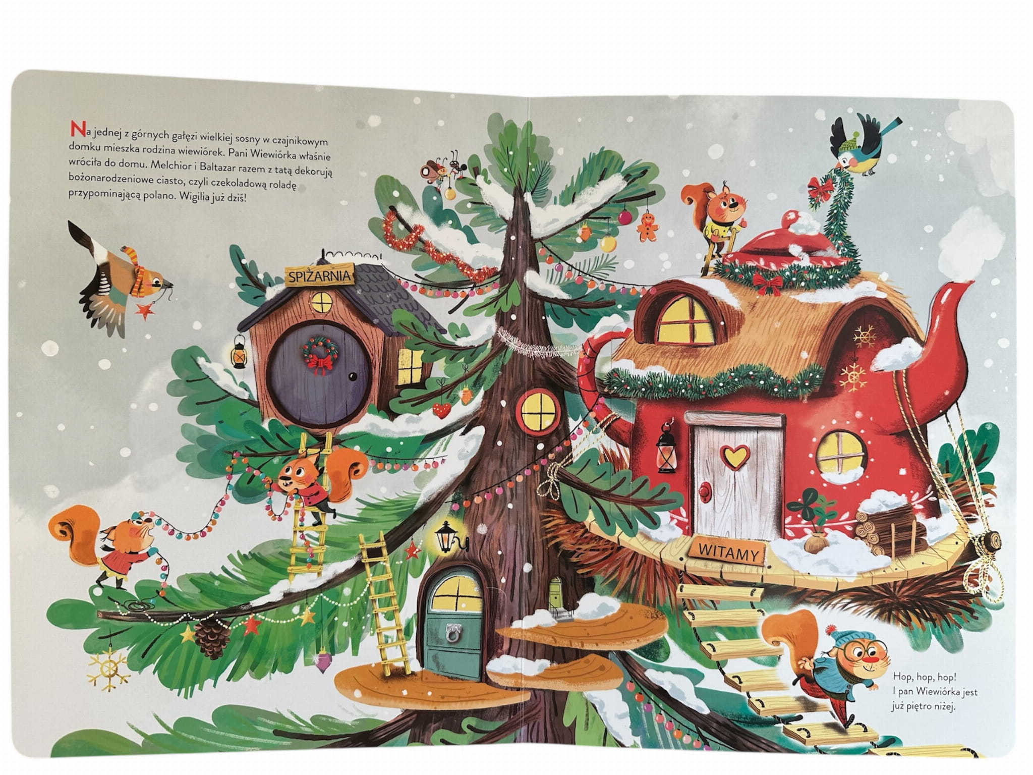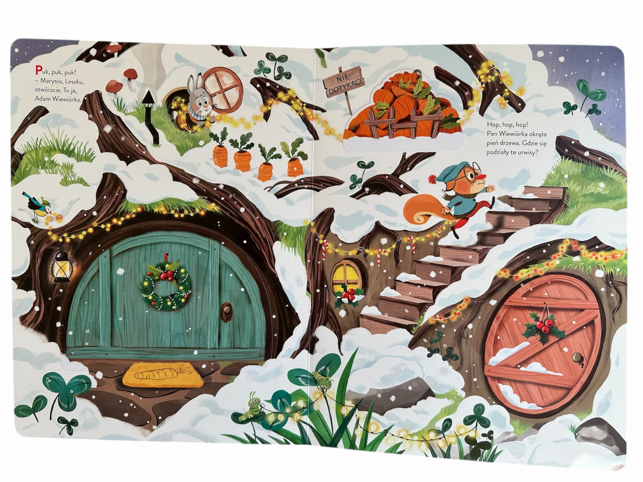 Zbliżają się święta Bożego Narodzenia! Mieszkańcy wielkiej sosny mają mnóstwo pracy: pieką ciasta, gotują wigilijne potrawy, dekorują swoje domy… Ale gdzie podział się mały Kacper Wiewiórka? Może jest u swojej przyjaciółki turkaweczki Zazy? Pomóż panu Adamowi Wiewiórce odszukać synka oraz jego małych przyjaciół. Otwieraj kolejne okienka i sprawdź, gdzie są wszystkie maluchy.