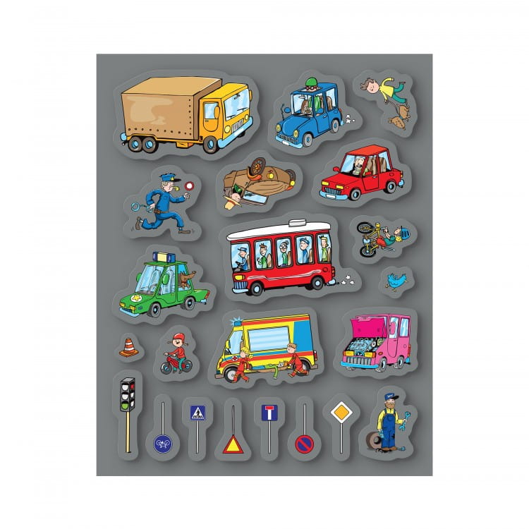 W tym zeszycie z naklejkami najmłodsi poznają różne środki transportu, które można spotkać na drodze, torach, na wodzie, placu budowy, a także w kosmosie.