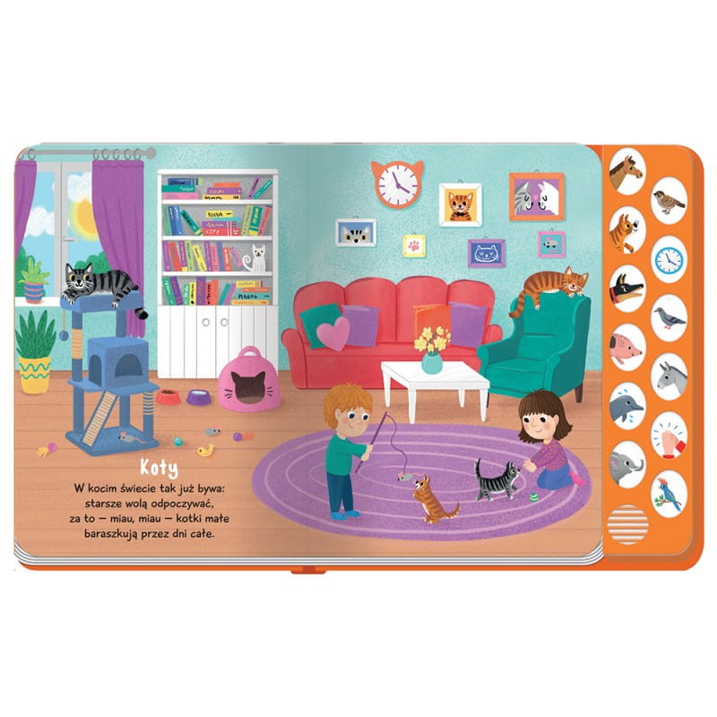 Książka dla małych miłośników zwierząt, a w niej bogate i staranne ilustracje oraz wierszowane historyjki o ulubionych zwierzakach. Dodatkową niespodzianką dla dzieci są dołączone dźwięki. Posłuchaj, jak brzmią: koń, kot, pies, świnka, delfin, słoń, papuga, osioł oraz inne zwierzęta i przedmioty pokazane w książce. Naciśnij przycisk z obrazkiem, aby włączyć dźwięk. Chcesz wyłączyć? Naciśnij przycisk jeszcze raz. Zabawa z książką rozwija zmysły malucha. Wesołe i łatwe do zapamiętania wierszyki rozwijają pamięć i percepcję dziecka, które wzbogaca również swoją wiedzę o odgłosy wydawane przez przedmioty i zwierzęta. Twarda oprawa i kartonowe karty sprawiają, że książka jest trwała i bezpieczna, a format odpowiedni dla małego dziecka. Do czytania, słuchania i oglądania!