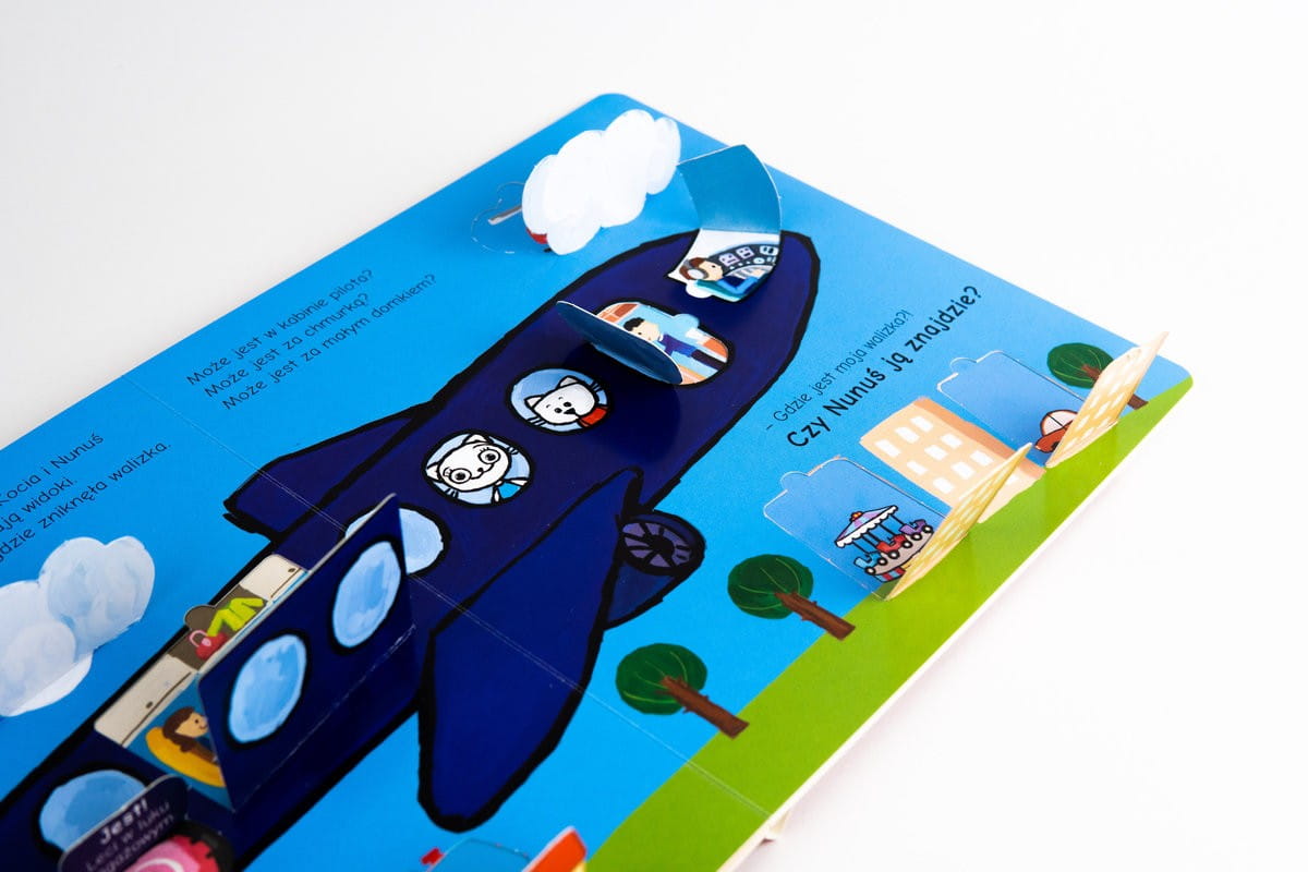 Kicia Kocia i Nunuś wybierają się na wakacje. Będą lecieć prawdziwym samolotem! Nunuś bardzo się cieszy na tę przygodę. Tylko gdzie się podziała walizka? Żeby ją znaleźć, trzeba się nie lada natrudzić – należy bowiem otworzyć aż 50 okienek! Książka idealna dla małych podróżników i wszystkich wielbicieli rezolutnej kotki!