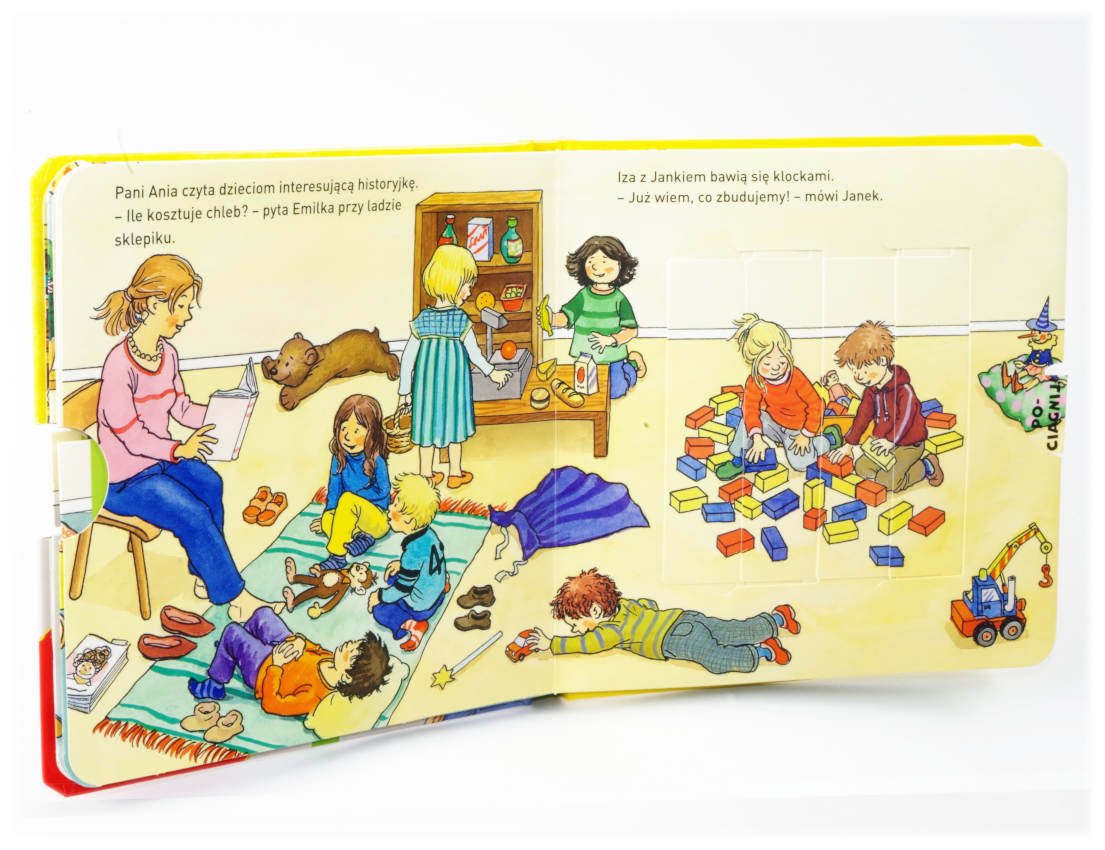 Dzięki rozsuwanym stronom zobaczymy jak wiele fajnych rzeczy dzieje się w przedszkolu.