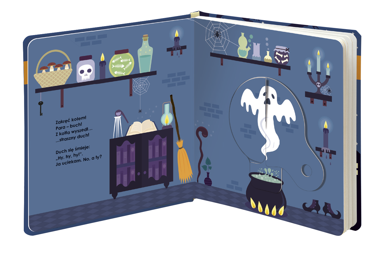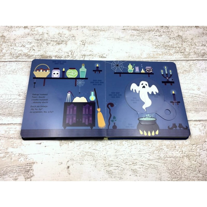 Wystarczy obrócić kołem, by odkryć magię. Obracające się koło zmienia wygląd strony, a także w zabawny sposób pokazuje, jak poradzić sobie ze straszydłami, np. gdzie schronić się przed pędzącą na miotle wiedźmą czy strasznym duchem.