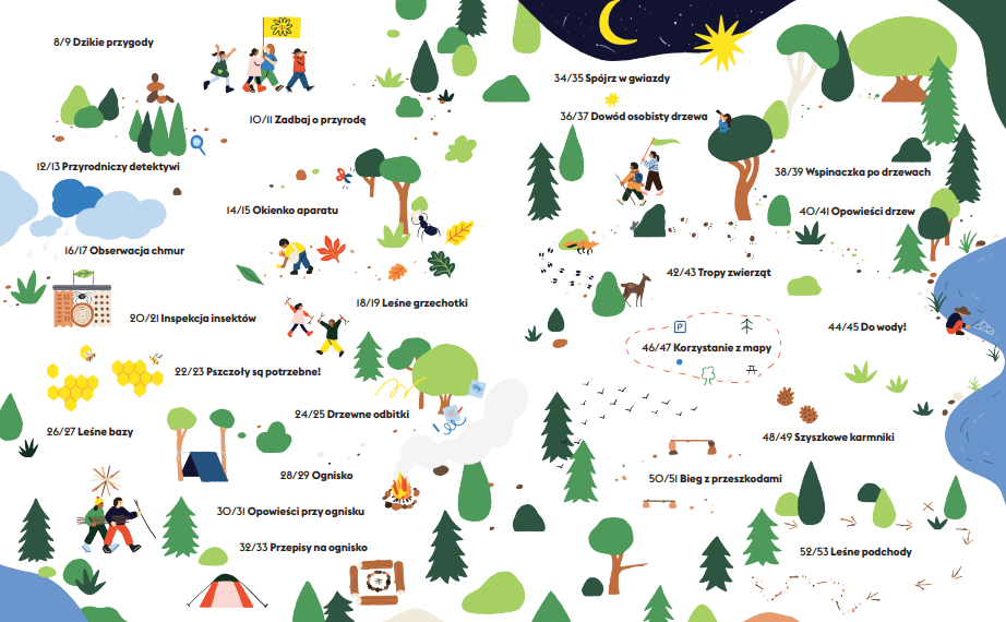 Dzięki zaproponowanym w książce aktywnościom dzieci przekonają się, czyje tropy można znaleźć w lesie i jak je rozpoznać, zrobią dowód osobisty drzewa, drzewne odbitki, leśne grzechotki i bazę. Zagrają w podchody, rozpalą ognisko, nauczą się czytać mapę oraz identyfikować insekty i gwiazdozbiory. A to tylko niewielka część aktywności, które ma do zaproponowania ta książka!