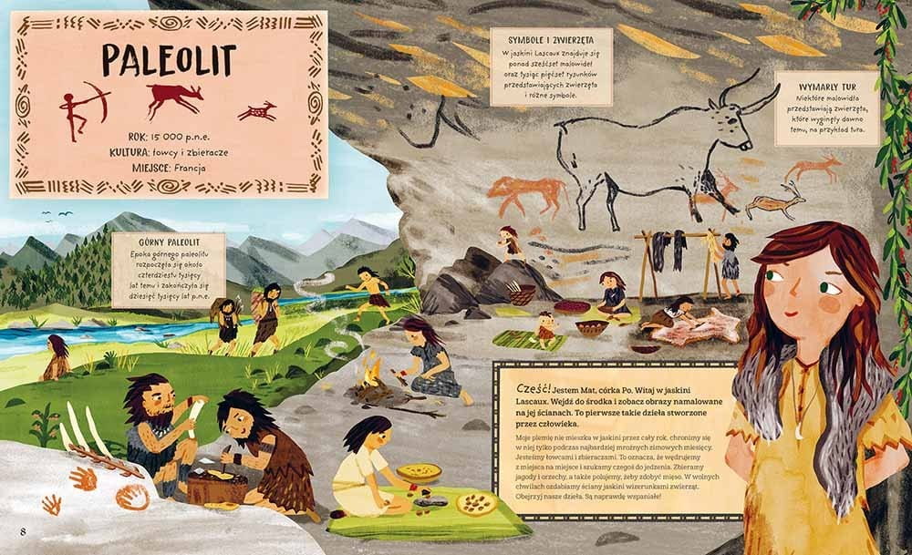 Żyjąca w paleolicie Mat pokaże nam fascynujące malowidła naskalne i zaprezentuje najnowszą kolekcję ubrań ze skór mamutów. Hanisz oprowadzi po sumeryjskim mieście Ur i nauczy grać w jedną z pierwszych gier planszowych. Z Arą ze starożytnego Egiptu poznamy świat faraonów – zwiedzimy piramidy i nauczymy się czytać hieroglify. Ki z plemienia Olmeków wyjaśni, skąd się wzięła gumowa piłka i jak przyrządzić pitną czekoladę. Suiko przedstawi nas szogunowi i samurajom na dworze cesarza Japonii, a Freya zaprosi na ucztę wikingów. To będzie niesamowita, zabawna i pouczająca podróż w czasie!