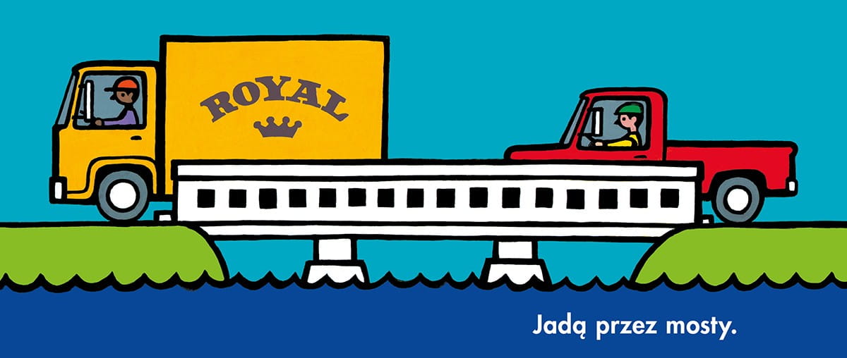 Ale dziś ruch na drogach! Przez miasteczko jadą śmieciarka i meblowóz, ciężarówka z piekarni przywiozła do sklepu pieczywo, wóz pomocy drogowej holuje zepsuty samochód, a betoniarka na budowie miesza beton. Jest nawet furgonetka z lodami!