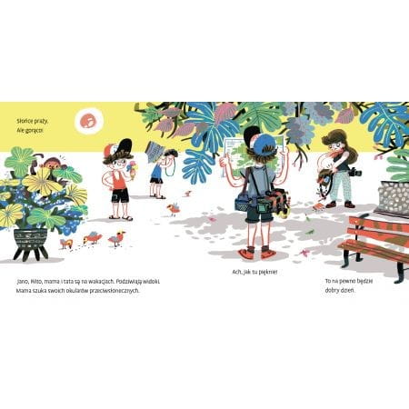 Tym razem cała rodzina jedzie na wakacje! Spotkamy krokodyl, papugi, słonia i... komary. Ale zaraz, zaraz, gdzie się podziały okulary mamy? To psotna małpka je zabrała. Szukaj ich na każdej stronie razem z Jano i Wito!