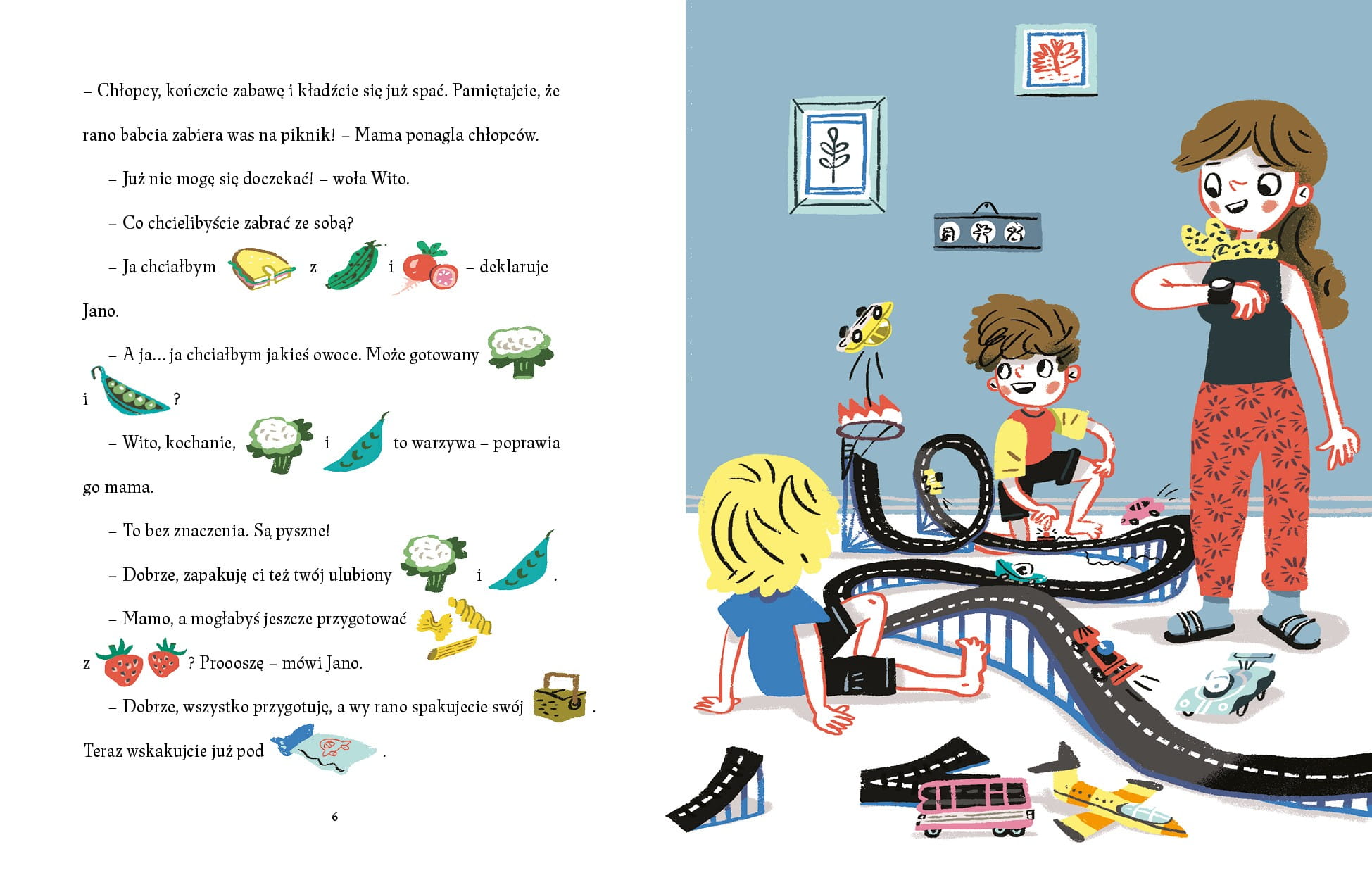 W książce niektóre wyrazy są zastąpione obrazkami, tak aby dziecko mogło samo wypowiadać pewne słowa: kanapka, kalafior, kubek, kartonik... Czytajcie razem, szukajcie litery "k" i powtarzajcie słowa.