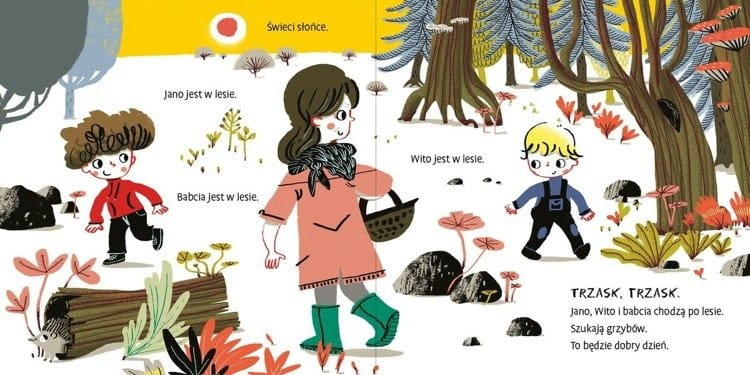Jano i Wito. W lesie to kartonowa książka, w której znajdziemy wiele wyrazów dźwiękonaśladowczych wspierających naukę mowy. Książeczka dla dzieci została stworzona przez mamę, logopedę i autorkę parentingowego bloga Matkawariatka która wie jak wspierać rozwój mowy u dzieci.