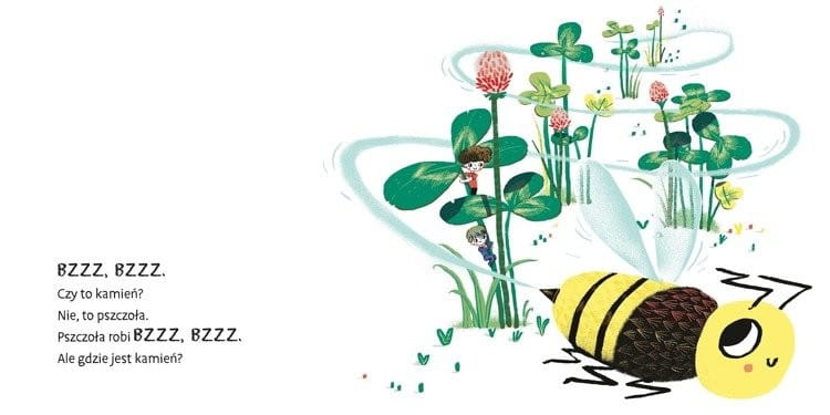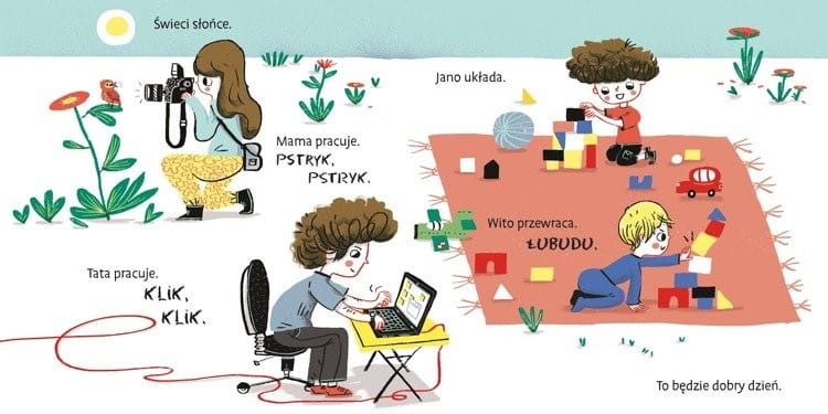 Książka zawiera krótkie i powtarzające się zdania. Dzięki temu dzieci szybko je zapamiętują i lubią powtarzać. Liczne onomatopeje: pstryk, łubudu, klik, bzz to wyrażenia od których dzieci zaczynają naukę mowy.
