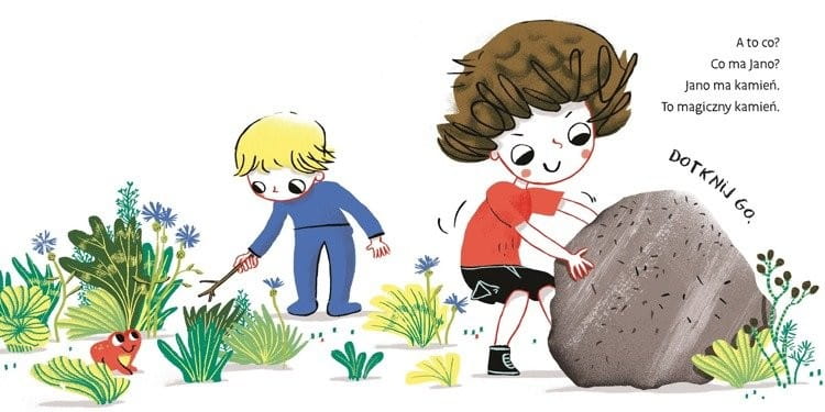 Kartonowa książka dla najmłodszych. Duży Jano i mały Wito znajdują tajemniczy kamień. Co się stanie, kiedy go dotkną? Ojej, to magiczny kamień!