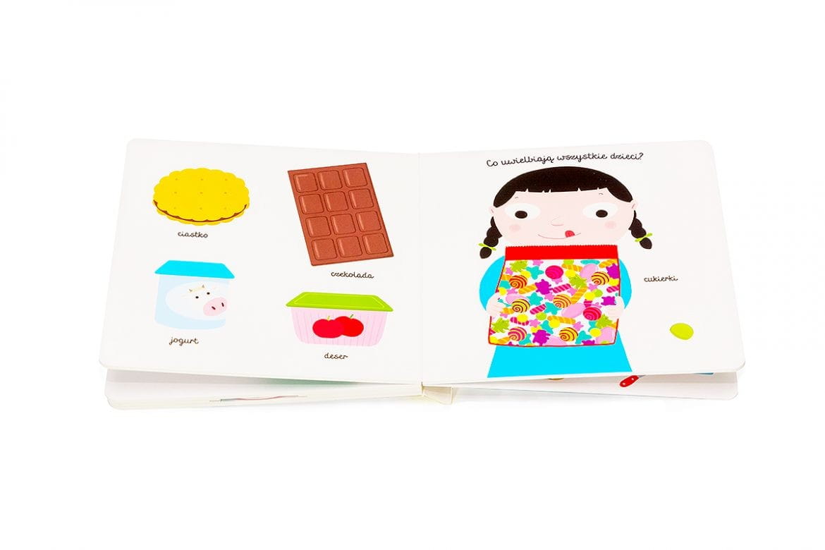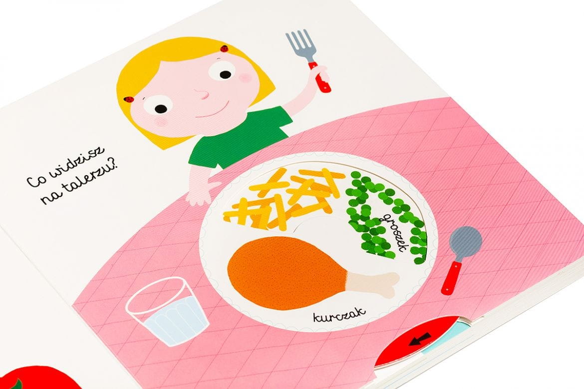 Z książeczką Jedzenie dzieci poznają nazwy warzyw i owoców, pieczywa, słodyczy i nabiału. Mogą przesuwać jedzenie na talerzu, nakarmić chłopca bananem, potrząsnąć torebką z cukierkami.
