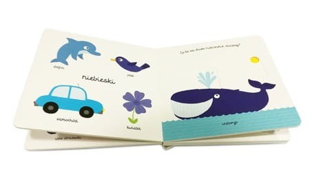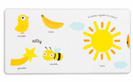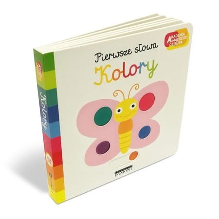 Książeczka dla maluchów Kolory na każdej stronie prezentuje inną barwę oraz przedmioty z otoczenia dziecka w danym kolorze. Poruszanie czerwoną wisienką, niebieskim wielorybem, zieloną żabką, czy żółtym słońcem sprawia dzieciom wiele radości i ćwiczy sprawność raczek.