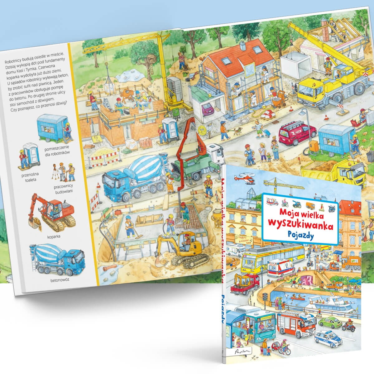 11 plansz ukazujących dziesiątki sytuacji z udziałem pojazdów, takich jak auto policyjne, karetka pogotowia czy wóz straży pożarnej. Obok każdej planszy krótka historyjka opisująca przedstawione miejsca oraz obrazki zachęcające do zabawy w wyszukiwanie.