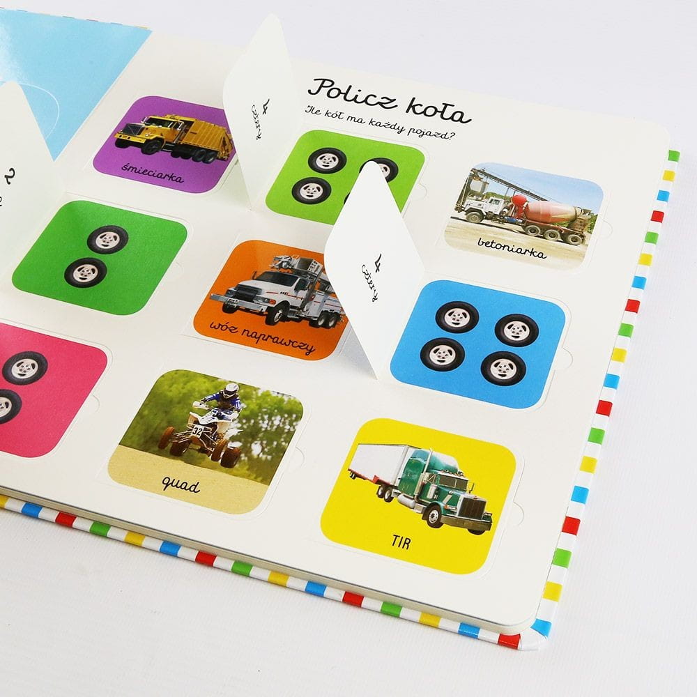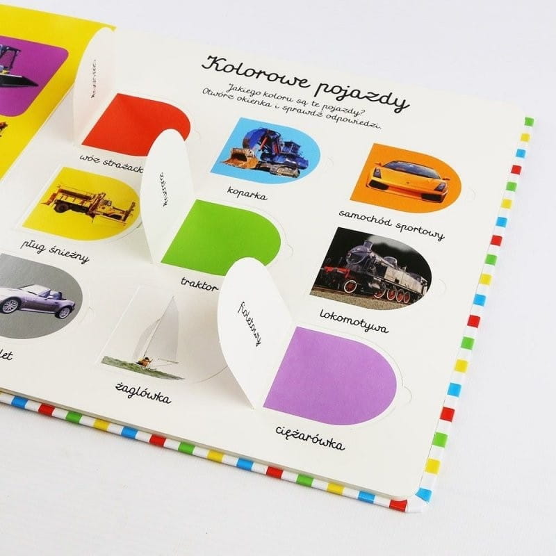 Książeczka z otwieranymi okienkami zabierze dziecko do fantastycznego świata pojazdów, wspiera rozwój mowy, poznawania nowych słów, kolorów, zjawisk. Wspaniała zabawa dla każdego malca, który chce odkrywać nowe rzeczy! Każda strona kryje ciekawe okienka do otwierania, dzieci uwielbiają uchylać okienka, by zajrzeć co kryje się pod spodem. Książka jest interaktywna, pełna niespodzianek, zadań, realnych obrazków pojazdów i ludzi.