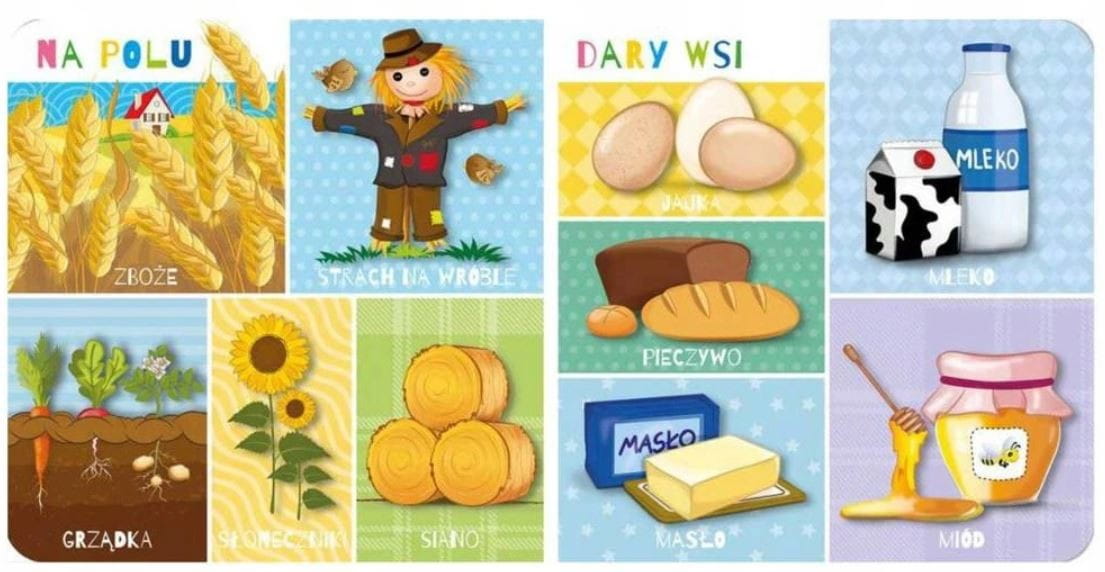 24 strony książeczki podzielone są na działy pozwalające dziecku na przyswojenie 100 słów i pojęć związanych z tematyką wsi, takich jak: przyroda i krajobraz, gospodarstwo i zabudowania, zwierzęta w domu i zagrodzie, pojazdy, maszyny i narzędzia, praca na wsi, zbiory i dary wsi … i wiele innych.
