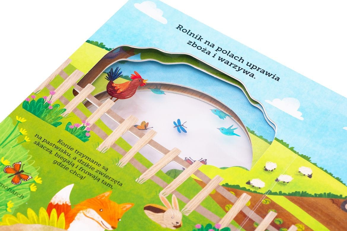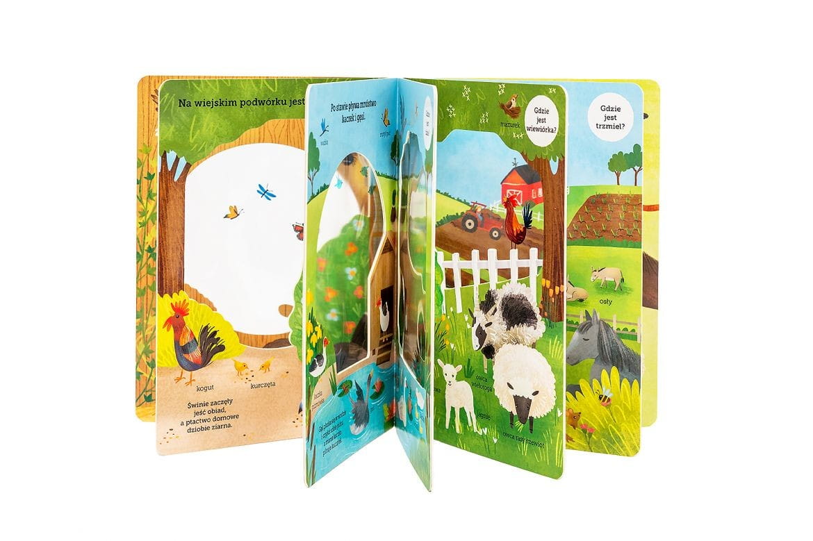 Książeczka Na farmie posiada bardzo lubiane przez dzieci okienka, które po trochu ujawniają co kryje się na kolejnych stronach. Kartonowa książeczka przeprowadza nas przez życie na farmie: wyprawa zaczyna się w stodole, potem zwiedzamy wiejskie podwórko, staw, łąki i ogródek. Z każdą stroną widzimy zwierzęta gospodarskie oraz możemy odpowiadać na zadanie pytania. Na końcu książki znajdują się wyszczególnione zwierzęta, sprawdź co o nich zapamiętałeś.