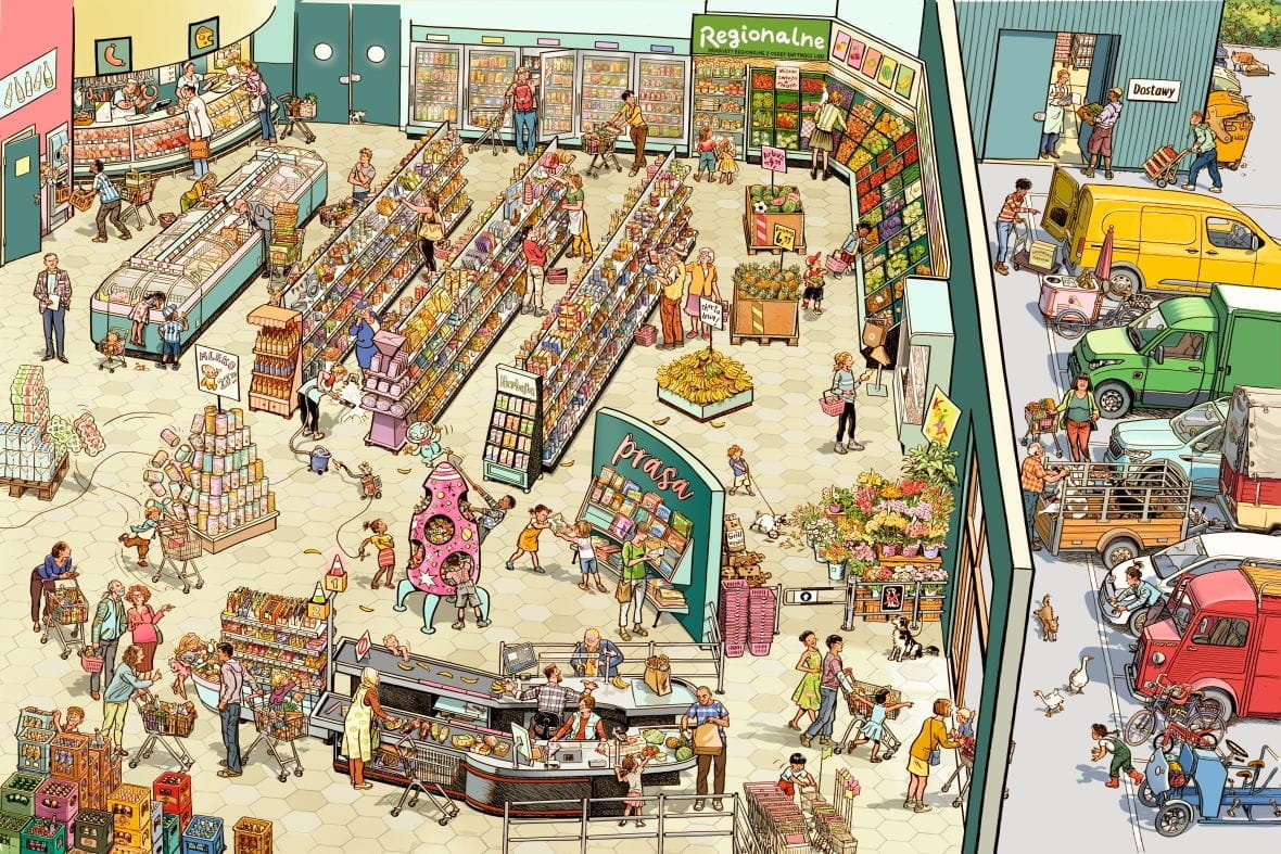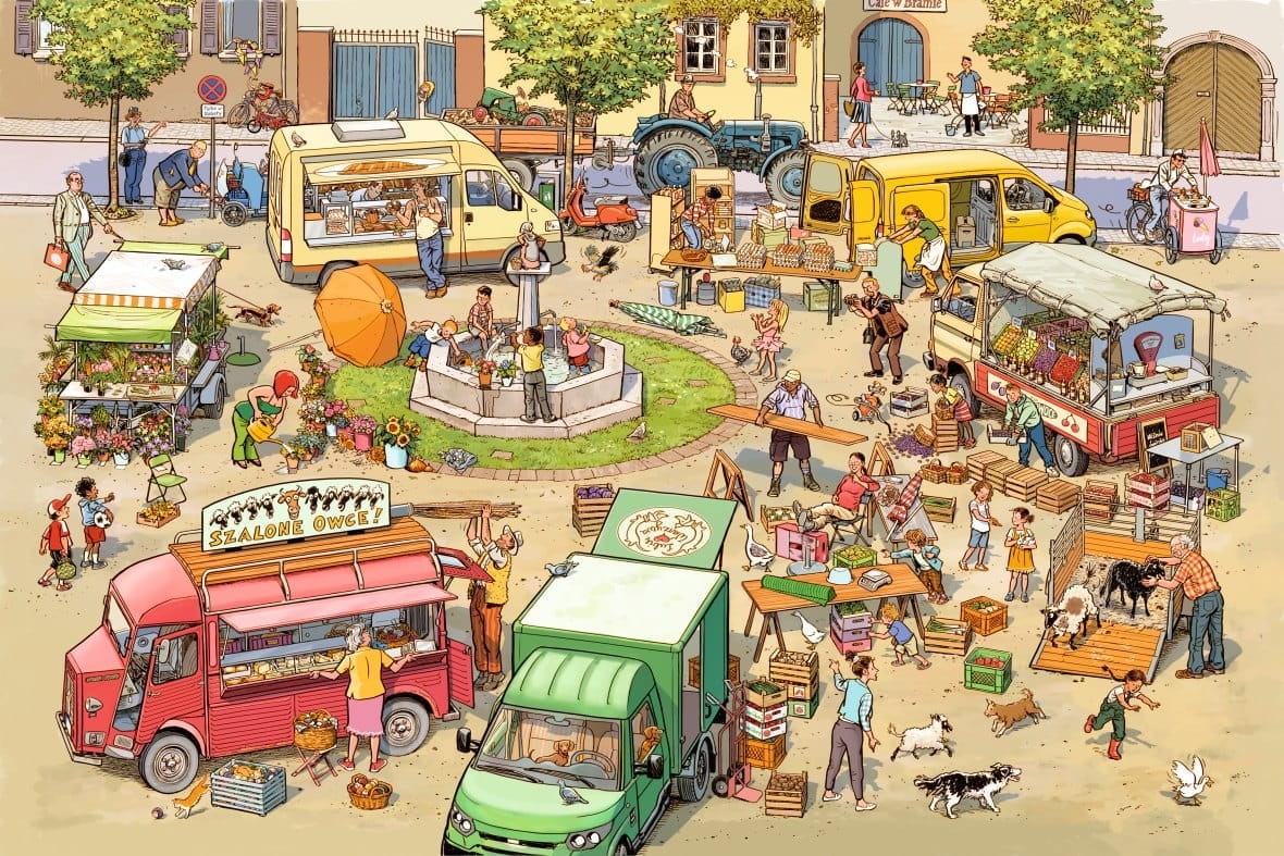 NA RYNECZKU to wielkoformatowa książka obrazkowa (picturebook) z twardego kartonu – każda rozkładówka to kolorowa panorama pełna niezwykłych przygód, z której oglądania nawet najmłodsze dzieci będą czerpać radość, rozpoznawać ulubione pojazdy i postacie oraz śledzić niezliczoną ilość zmieniających się szczegółów.