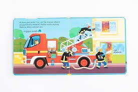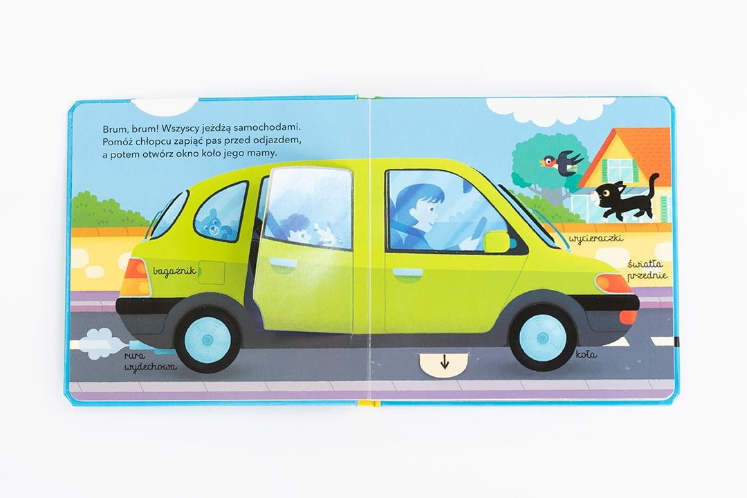 Książeczka dla maluchów Pojazdy przedstawia: samochód osobowy, w którym możemy tworzyć okno i drzwi; pociąg, możemy zajrzeć do przedziału i wysadzić pasażerów; wóz strażacki, gdzie pomagamy strażakom rozsunąć drabinę i sprawdzić kogo uratować z płonącego budynku; a ponadto koparkę, żaglówkę i samolot - wszędzie tam możemy zajrzeć.