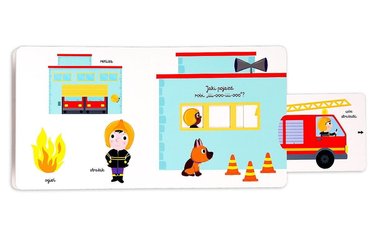 Książeczka z ruchomymi elementami Strażacy znakomicie pokazuje jak wygląda zawód strażaka, praca o jakiej marzy większość małych dzieci.