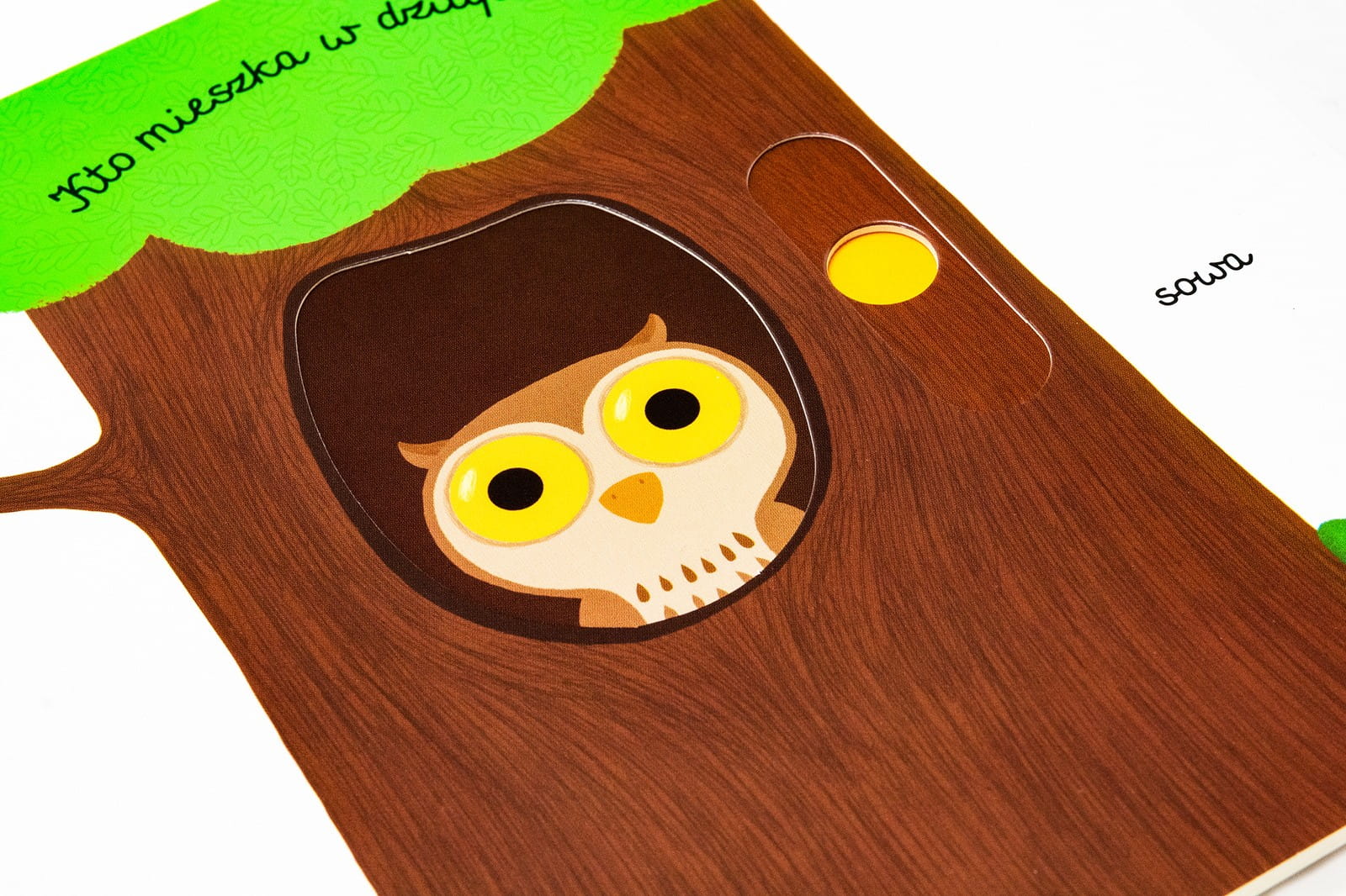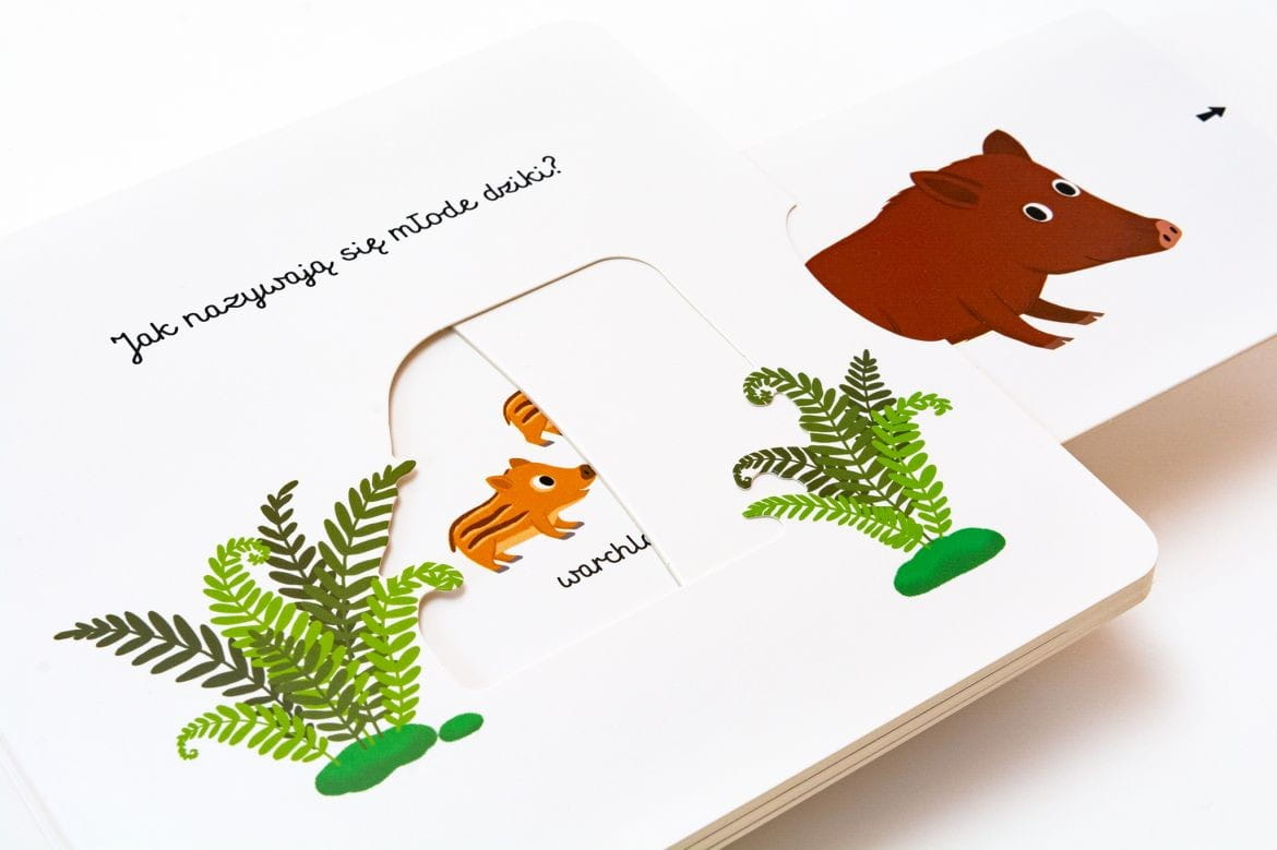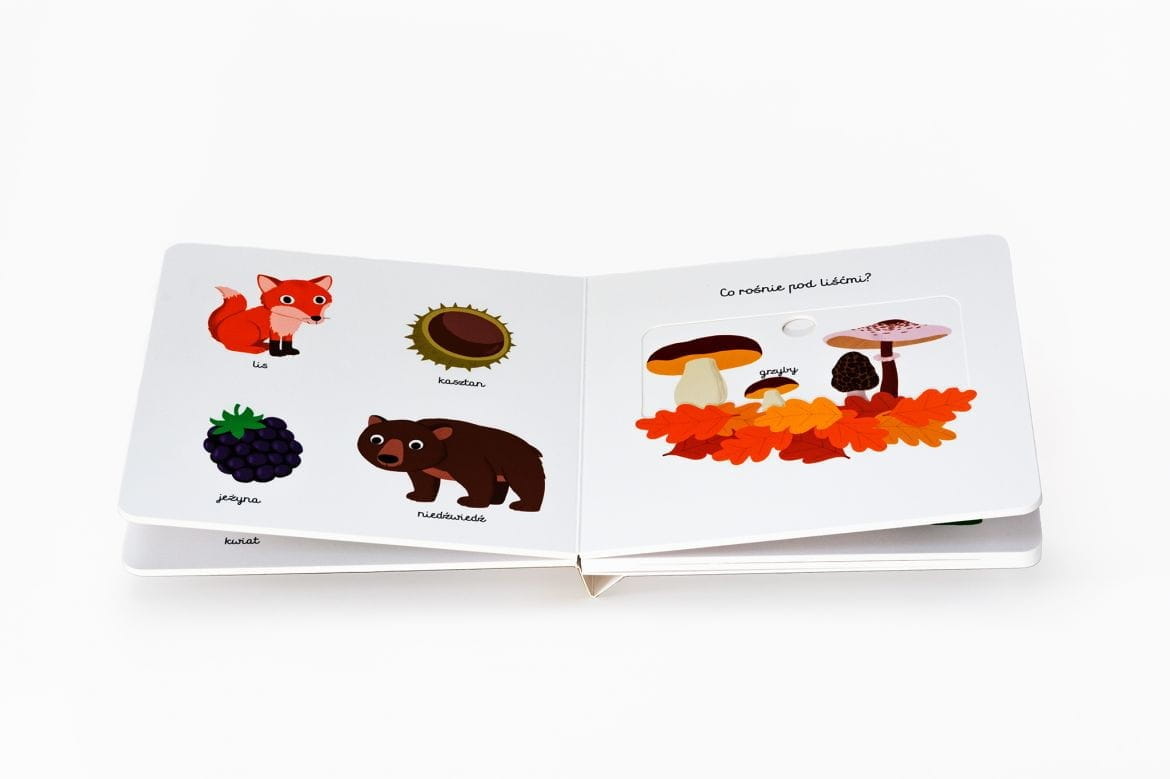 Książeczka z ruchomymi elementami W lesie, dzięki której dziecko poznaje wygląd i nazwy zwierząt leśnych oraz dary lasu.