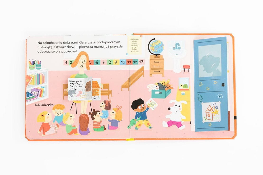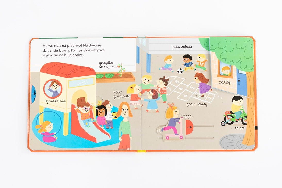 Książeczka z ruchomymi elementami i okienkami "W przedszkolu" to świetna pozycja literatury dziecięcej, z która odwiedzamy przedszkole, obserwujemy co robią dzieci i czego się uczą oraz sami możemy przyłączyć się do zabawy: otworzyć drzwi do przedszkola, zakręcić kołem pogodowym, ułożyć puzzle, powygłupiać się na placu zabaw, zajrzeć do dziecięcej toalety, sprawdzić co dzieci zjedzą na obiad, a podczas drzemki przykryć maluszki kocykiem.