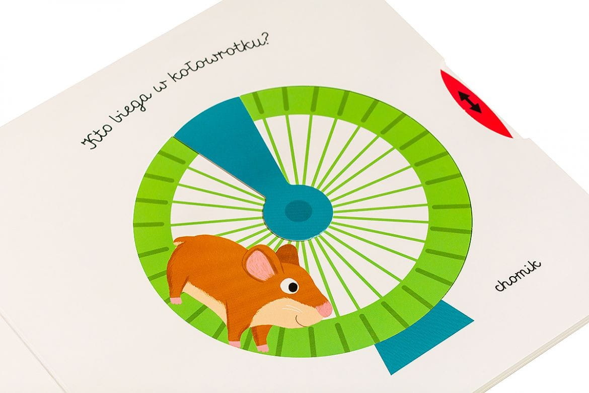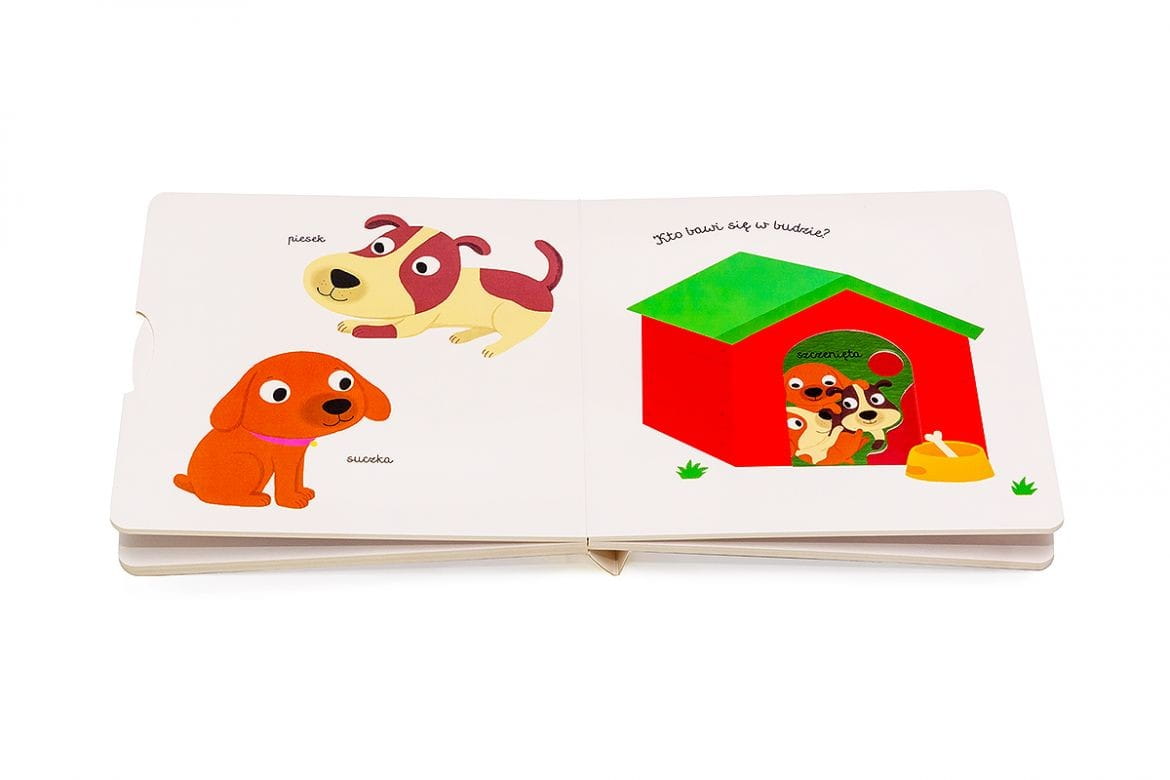 Książeczka z ruchomymi elementami Zwierzęta domowe, dzięki której dziecko bliżej poznaje domowych pupili, jak się nazywają i czym się bawią.