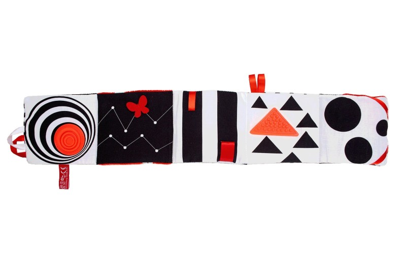 Książeczka sensoryczna Iluzja, w formie harmonijki pełna jest niespodzianek, geometrycznych kształtów i kontrastów. To, co wyróżnia ten produkt od innych książeczek sensorycznych, to zastosowanie w nim gumowych elementów sensorycznych. Wkomponowany w książeczkę trójkąt o fakturze „jeżyka”, czy spiralna „głębia” nadająca poczucie iluzji zapewniają niezapomniane wrażenia sensoryczne. Liczne elementy interaktywne, takie jak szeleszczące strony i metki z pewnością zapewnią dziecku wspaniałą zabawę, dodatkowo stymulując jego zmysły. Dostosowaliśmy rozmiar książeczki tak, aby dziecko mogło ją z łatwością złapać i w pełni korzystać z jej walorów.