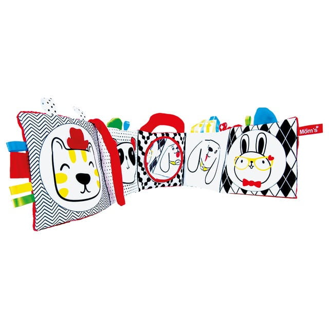 Materiałowa książeczka jest mięciutka i bardzo przyjazna dla dzieci już od urodzenia. Książeczka rozkładana jak harmonijka ma sznureczki, by przywiązać ją do łóżeczka. Kontrastowa książeczka ma w sobie wiele niespodzianek i ciekawych aktywność dla najmniejszych dzieci. Biało-czarna książeczka z kolorowymi detalami ułatwia wodzenie spojrzeniem i wpatrywanie się w zabawki, co rozwija zmysł wzroku oraz spostrzegawczość maluszka.