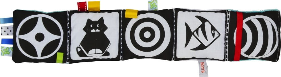 Materiałowa książeczka jest mięciutka i bardzo przyjazna dla dzieci już od urodzenia. Książeczka rozkładana jak harmonijka ma w sobie wiele niespodzianek i ciekawych aktywność dla najmniejszych dzieci. Biało-czarna książeczka z czerwonymi detalami ułatwia wodzenie spojrzeniem i wpatrywanie się w zabawki, co rozwija zmysł wzroku oraz spostrzegawczość maluszka.