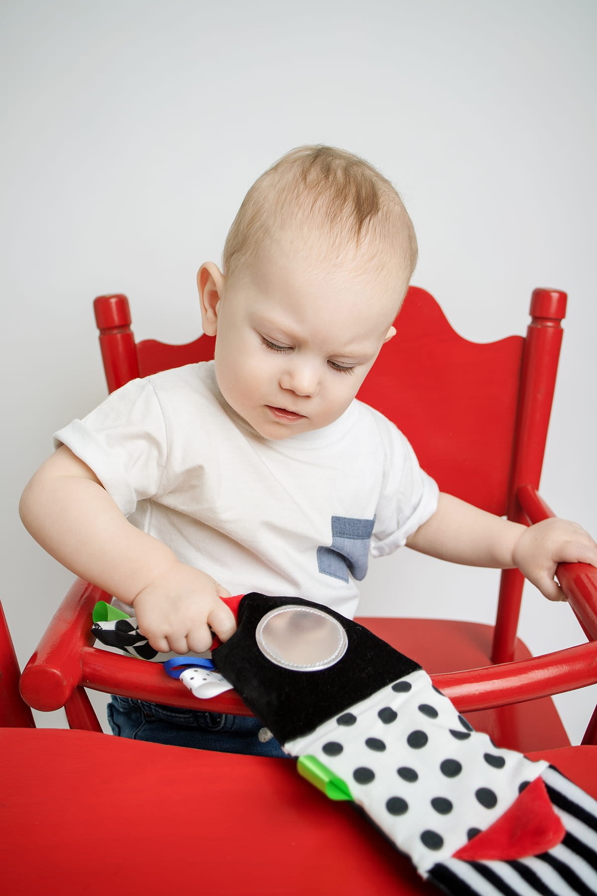 Zabawa poprzez oglądanie kontrastowych barw i dotyk szeleszczących elementów rozwija zmysł wzroku, słuchu i dotyku.
