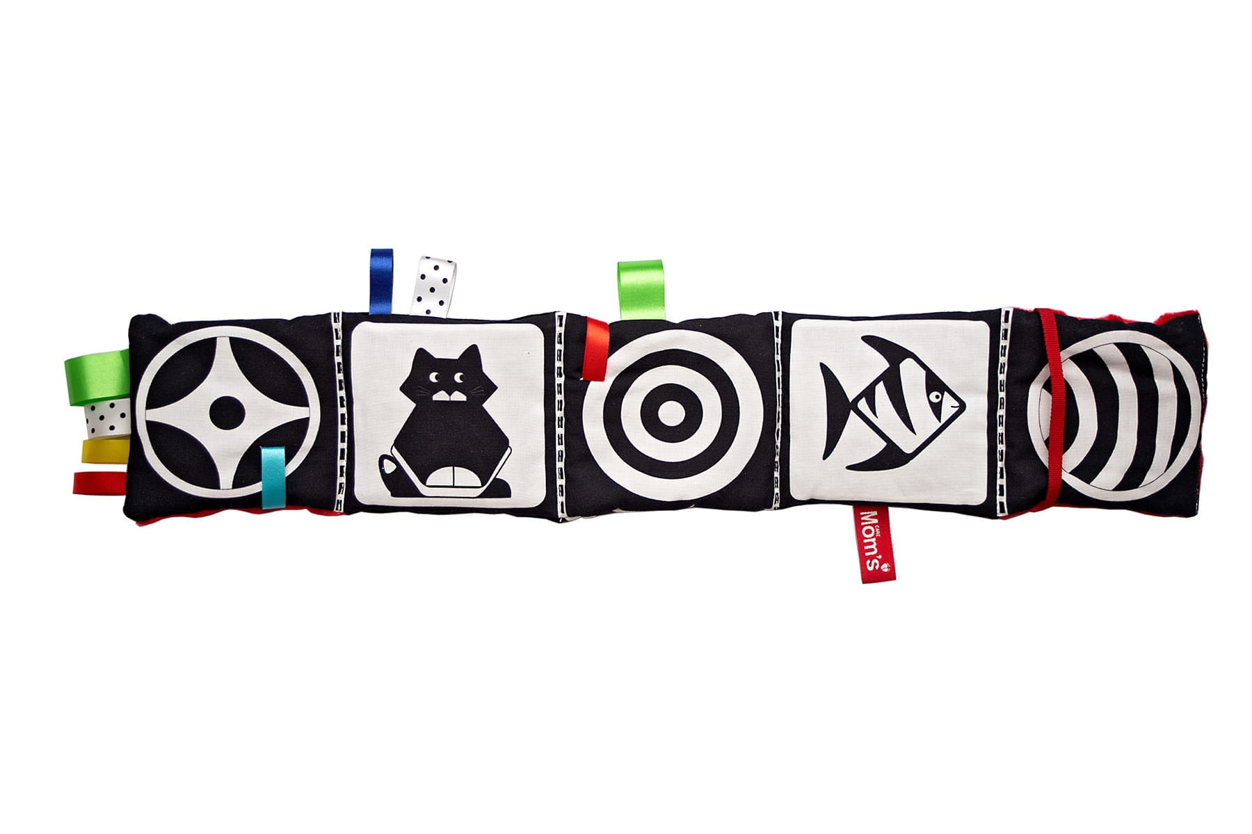 Materiałowa książeczka jest mięciutka i bardzo przyjazna dla dzieci już od urodzenia. Książeczka rozkładana jak harmonijka ma w sobie wiele niespodzianek i ciekawych aktywność dla najmniejszych dzieci. Biało-czarna książeczka z niebieskimi detalami ułatwia wodzenie spojrzeniem i wpatrywanie się w zabawki, co rozwija zmysł wzroku oraz spostrzegawczość maluszka.