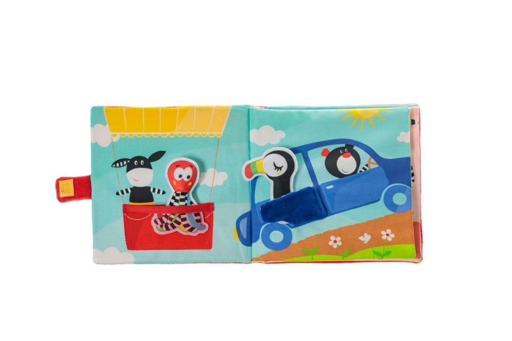 Multisensoryczna Książeczka „Lot balonem” zawiera 8 materiałowych, kolorowych stron w formie historyjek oraz 5 postaci miękkich i przyjaznych zwierzątek.