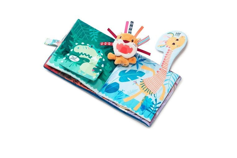 Miękka książeczka dla niemowląt Lew Jack Lilliputiens z pacynką opowiada o różnych emocjach, a na końcu ma bezpieczne lusterko. Dziecko samo może wyrażać różne emocje spoglądając do lusterka. Materiałowa książeczka jest pełna niespodzianek, sensorycznych elementów i pomaga w rozwoju dzieci.