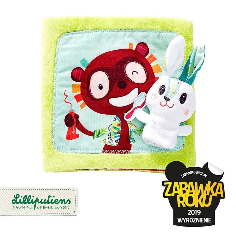 Miękka książeczka dla niemowląt Lilliputiens z pacynką, która zachęca dzieci do mycia ząbków. Królik dentysta jest pacynką wkładaną na palec, w łapce trzyma szczoteczkę do zębów i po kolei myje zęby swoim przyjaciołom. Nie obawia się paszczy lwa, ostrych zębów krokodyla, czy błyszczącego uśmiechu sprytnego liska.