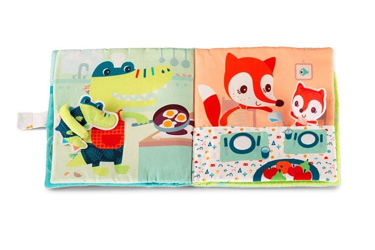 Ta miękka książeczka dla dzieci jest uszyta trochę na zasadzie książeczki Quiet Book, ma wystające i ruchome elementy, różne faktury i kontrastowe kolory. Książeczka jest zapinana na rzep, wykonana z niezwykłą dbałością o każdy detal.