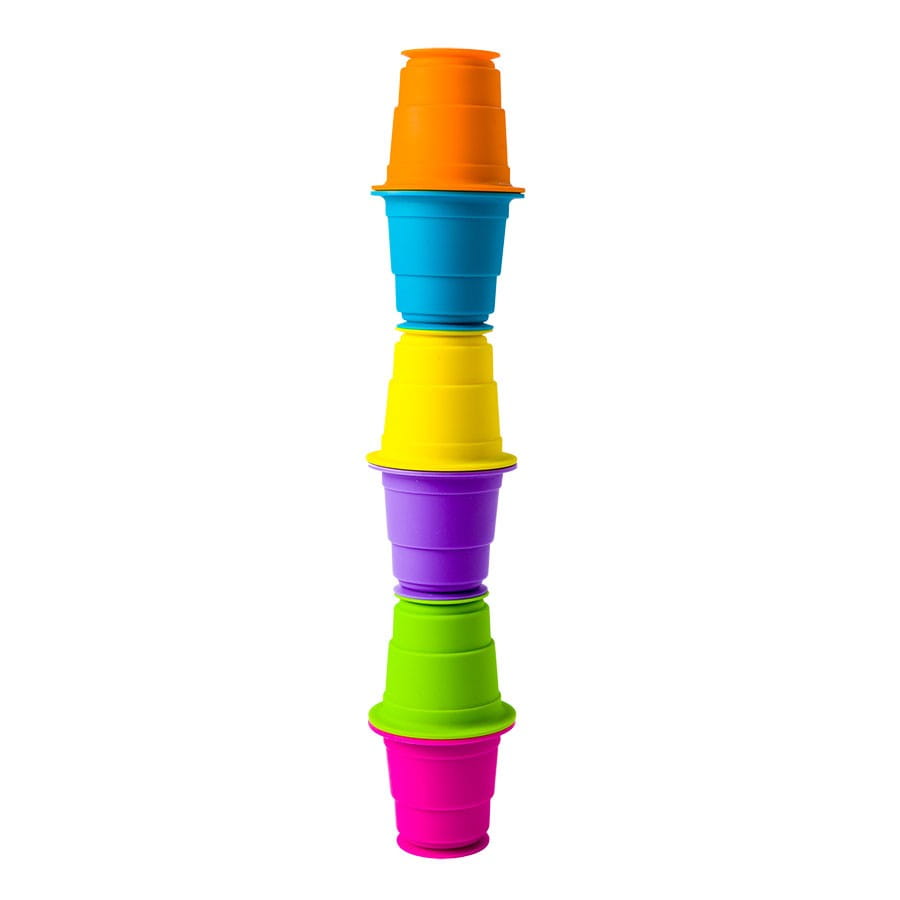Silikonowe kubeczki są miękkie i przyczepiają sie wielu powierzchni oraz siebie nawzajem dzięki przyssawce na spodzie. Kubeczki z silikonu można przysysać do siebie twarzą ciągi i wierze, oraz do gładkich powierzchni blatu, szyby, podłogi, płytek, czy lodówki. Ponadto dzieci mogą wykorzystać je do zabaw w piasku i wodzie, w podróży, układać, segregować kolorami, wkładać jeden w drugi, turlać, składać, wywijać na lewą stronę i bawić się bez końca. Kreatywne kubeczki zostały wykonane z silikonu spożywczego, dzięki czemu można z nich bezpiecznie pić i jeść.