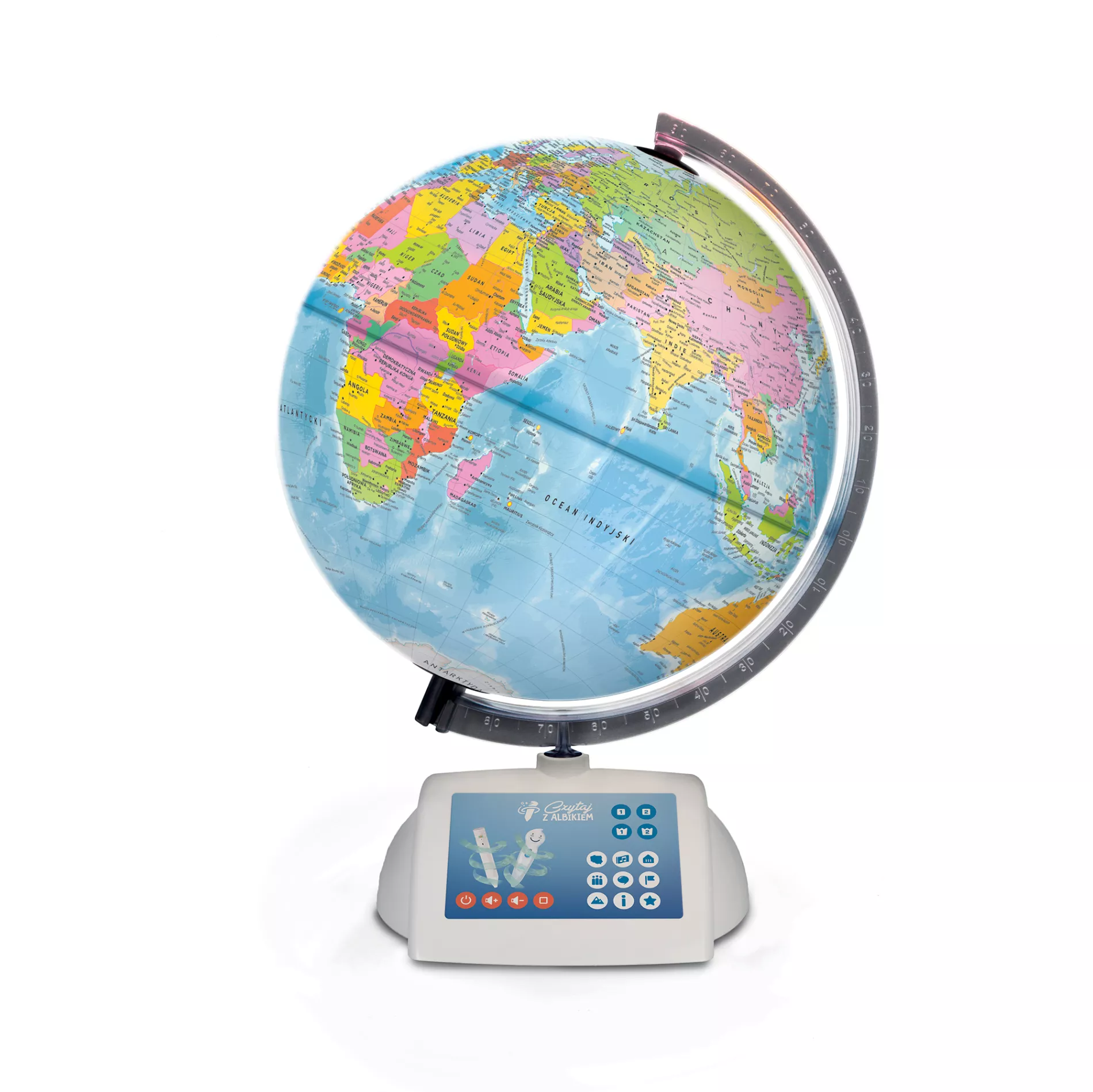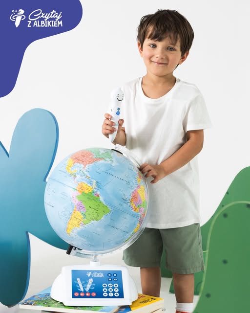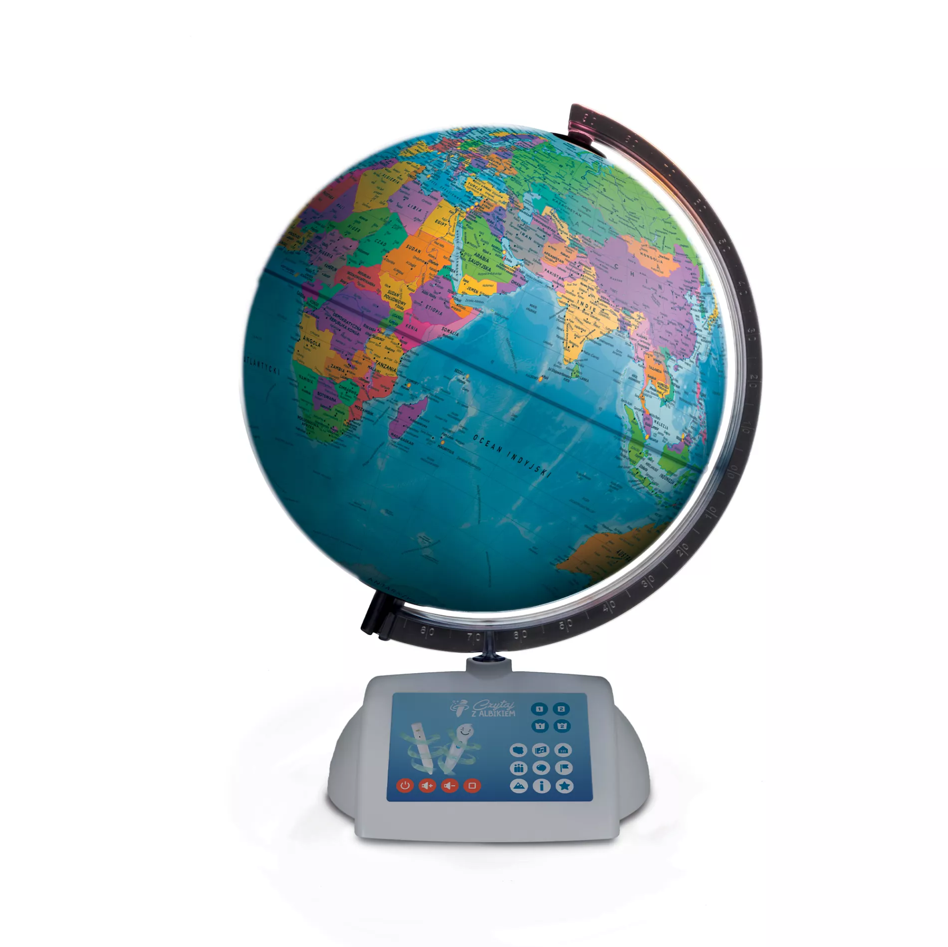 Globus znany był już w starożytności. Stworzył go genialny matematyk, fizyk i astronom – Archimedes. Powstające przez wieki globusy stawały się coraz dokładniejsze. Globus, który masz przed sobą, doskonale odzwierciedla mapę świata, a do tego potrafi mówić. Archimedes z pewnością byłby zaskoczony! Wiadomości zawarte w globusie można usłyszeć dzięki mówiącemu pióru Albik, które odczyta wiele informacji i ciekawostek o prawie 200 krajach świata. Firma Tecnodidattica zaprojektowała ten globus ze specjalistami w dziedzinie geografii. Dzięki temu dane zawarte w oprogramowaniu są możliwie najdokładniejsze i najaktualniejsze. Z pomocą interaktywnego globusa dzieci poznają wszystkie kraje i ich stolice. Usłyszą hymny i liczne ciekawostki. Dzięki quizom będą się świetnie bawić i utrwalać wiedzę.