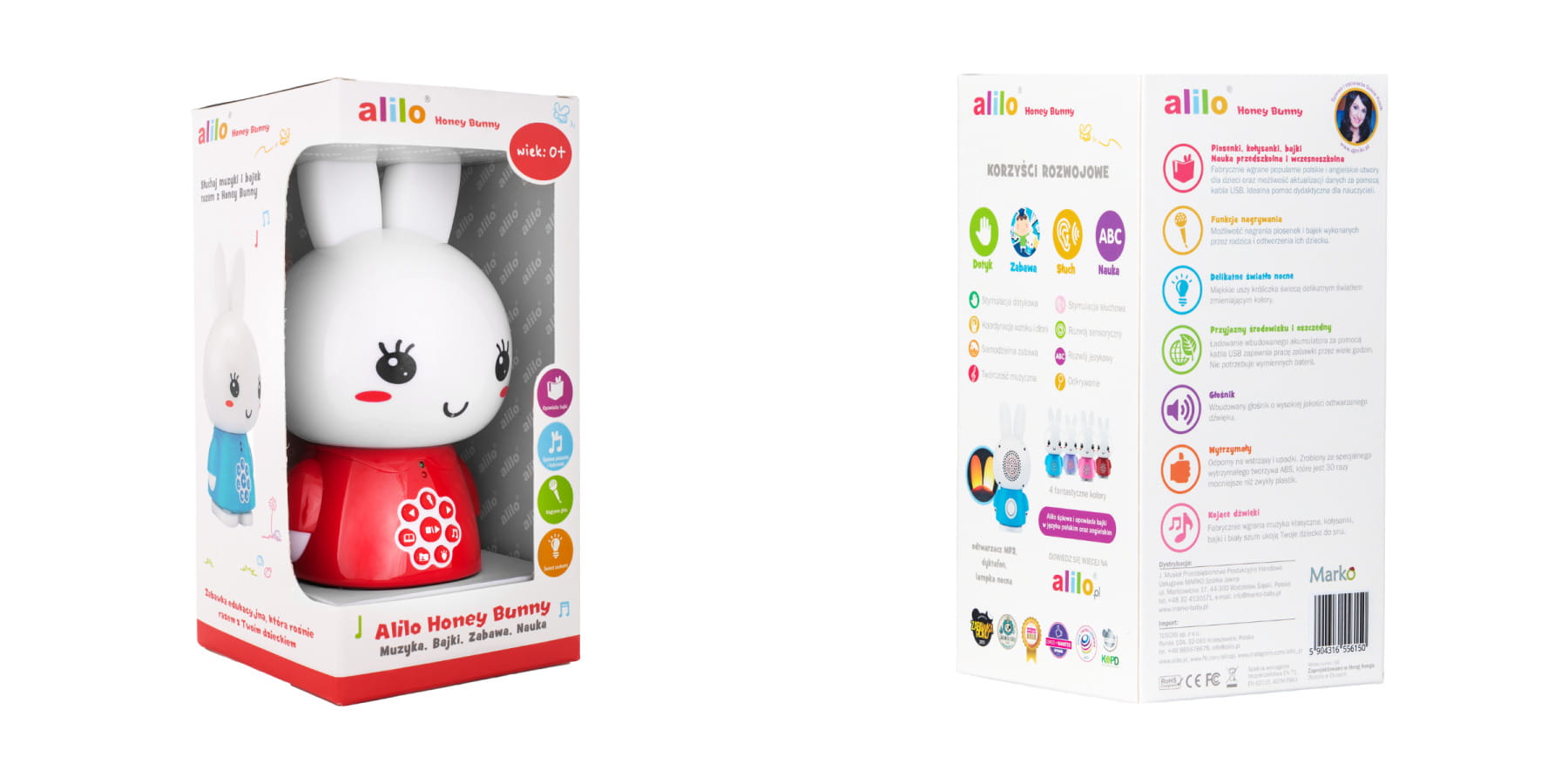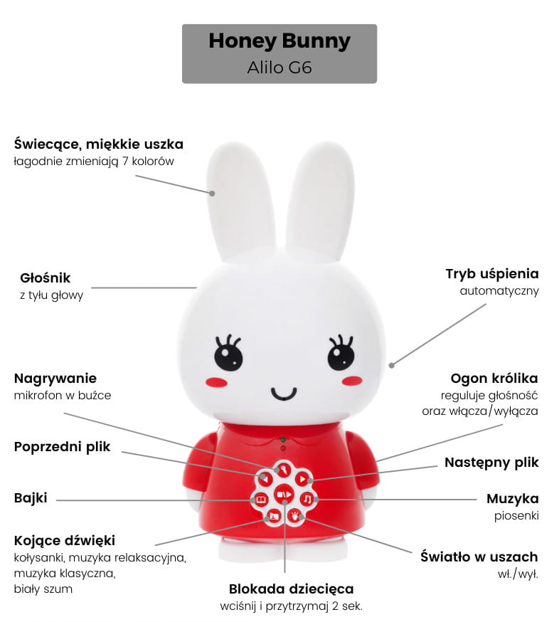 Alilo to innowacyjne interaktywne zabawki edukacyjne dla dzieci. Króliczki mogą śpiewać piosenki, opowiadać bajki, nagrywać Twój głos i odtwarzać go, a także wspaniale sprawdzają się jako lampka nocna, odtwarzacz MP3, dyktafon lub pomoc dydaktyczna.