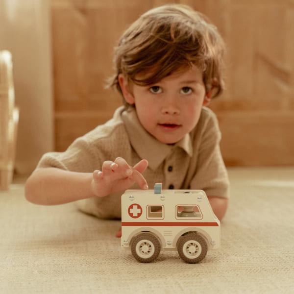 Drewniane auto ambulans z wyjmowanym ludzikiem. Wykonane z drewna, pomalowane bezpiecznymi farbami na bazie wody. Łatwy i wygodny do chwytania przez małe rączki.